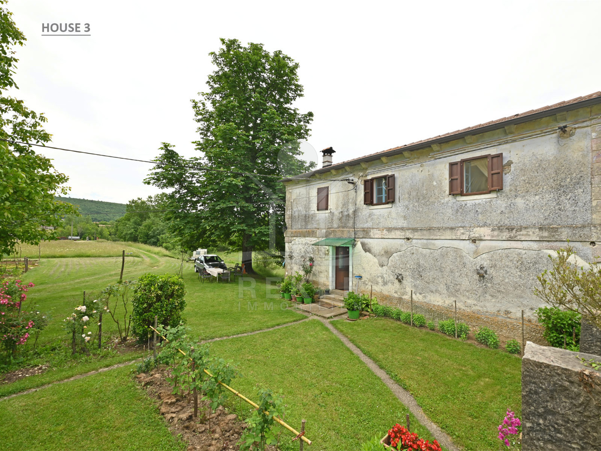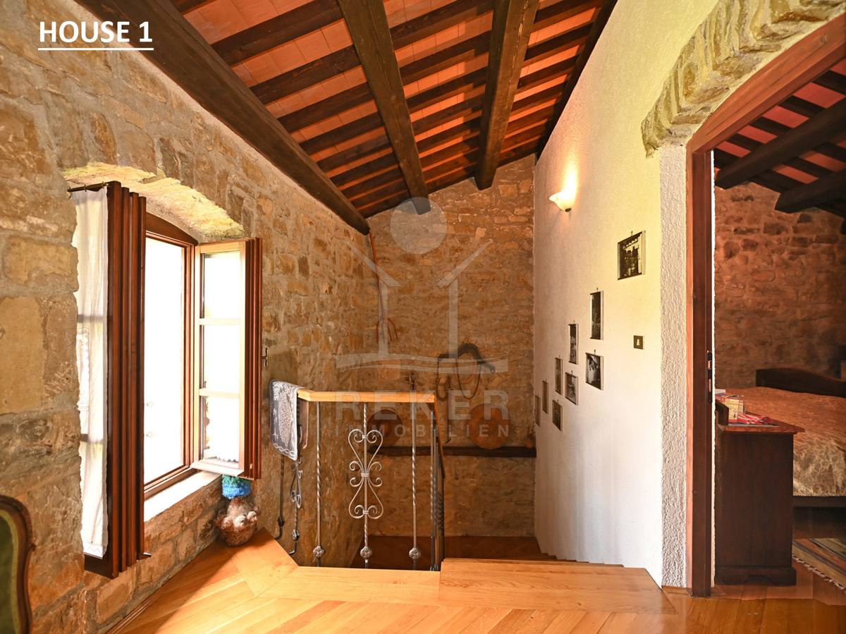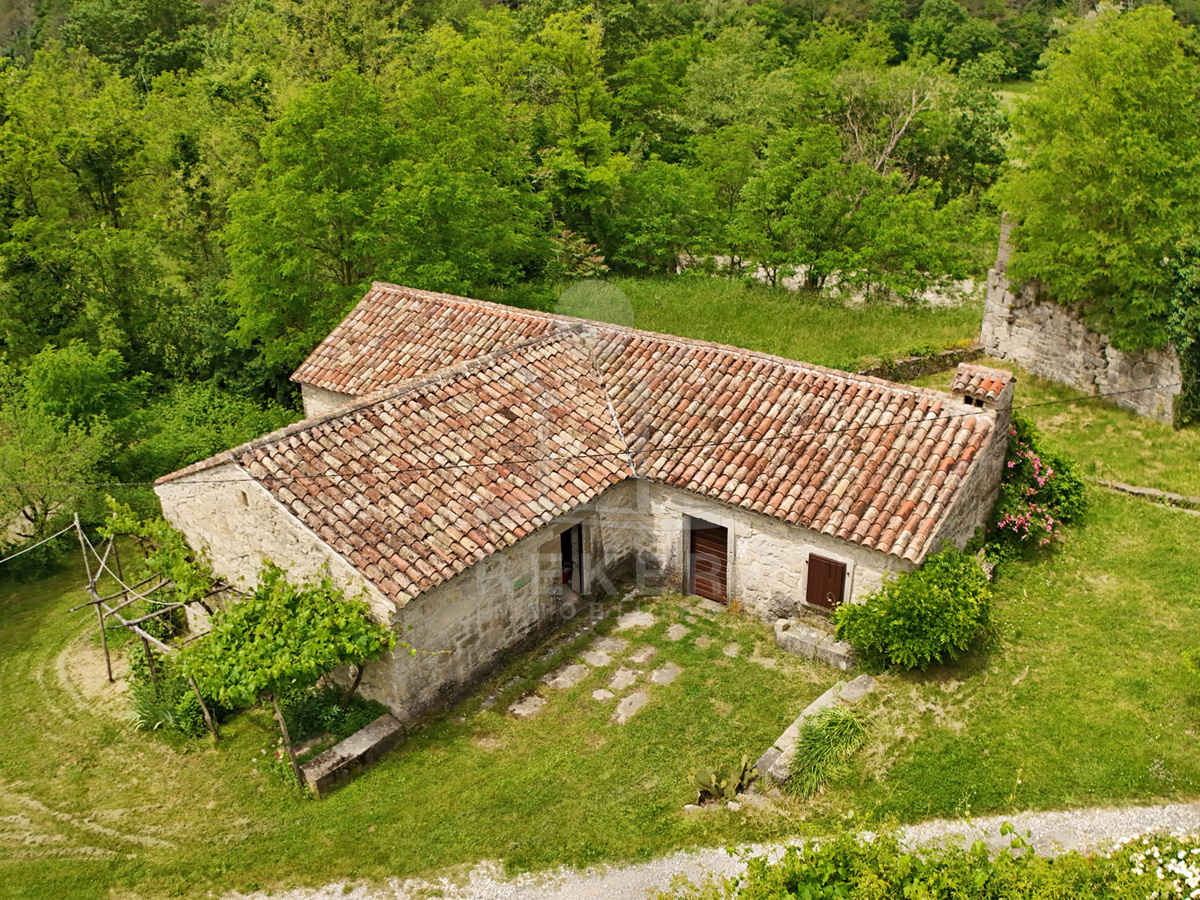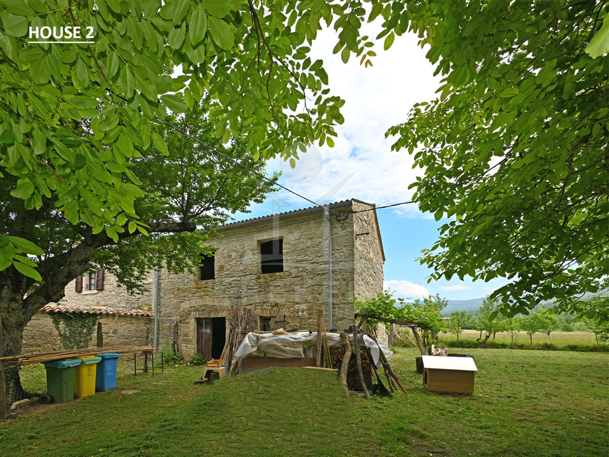 Dieses Anwesen liegt in einem kleinen, abgeschiedenen Weiler in der Nähe von Lupoglav – mitten im Grünen, aber gut angebunden. Zur Küste sind es nur 30 Minuten, zur Autobahn 15. Und genau hier, zwischen Feldern, Wiesen und dem Učka-Massiv, verbirgt sich ein echtes Stück Istrien: Ein Ensemble aus vier Gebäuden mit Geschichte, Charakter und großem Potenzial. Der Fluss Boljunčica fließt in der Nähe – manchmal still, manchmal lebendig. Hier leben Sie mit der Natur, nicht neben ihr.