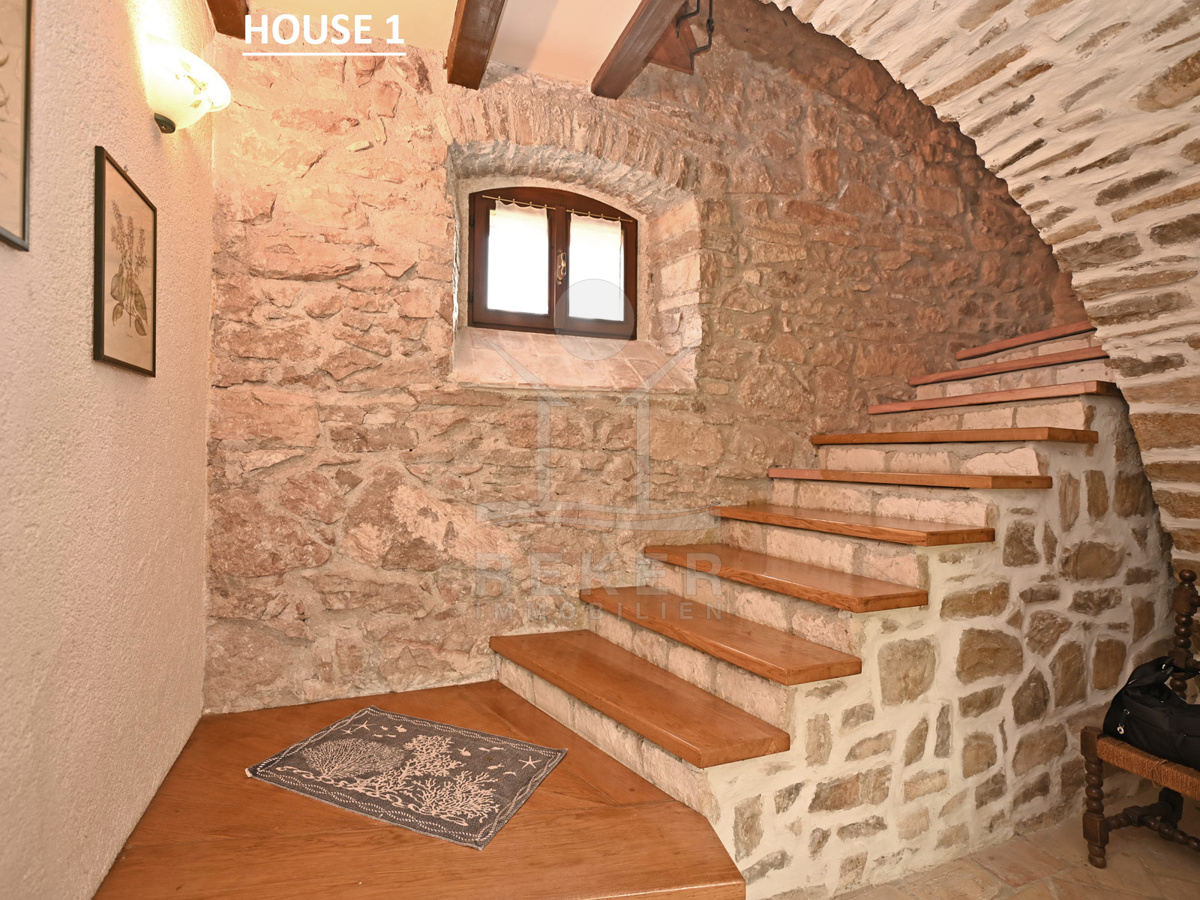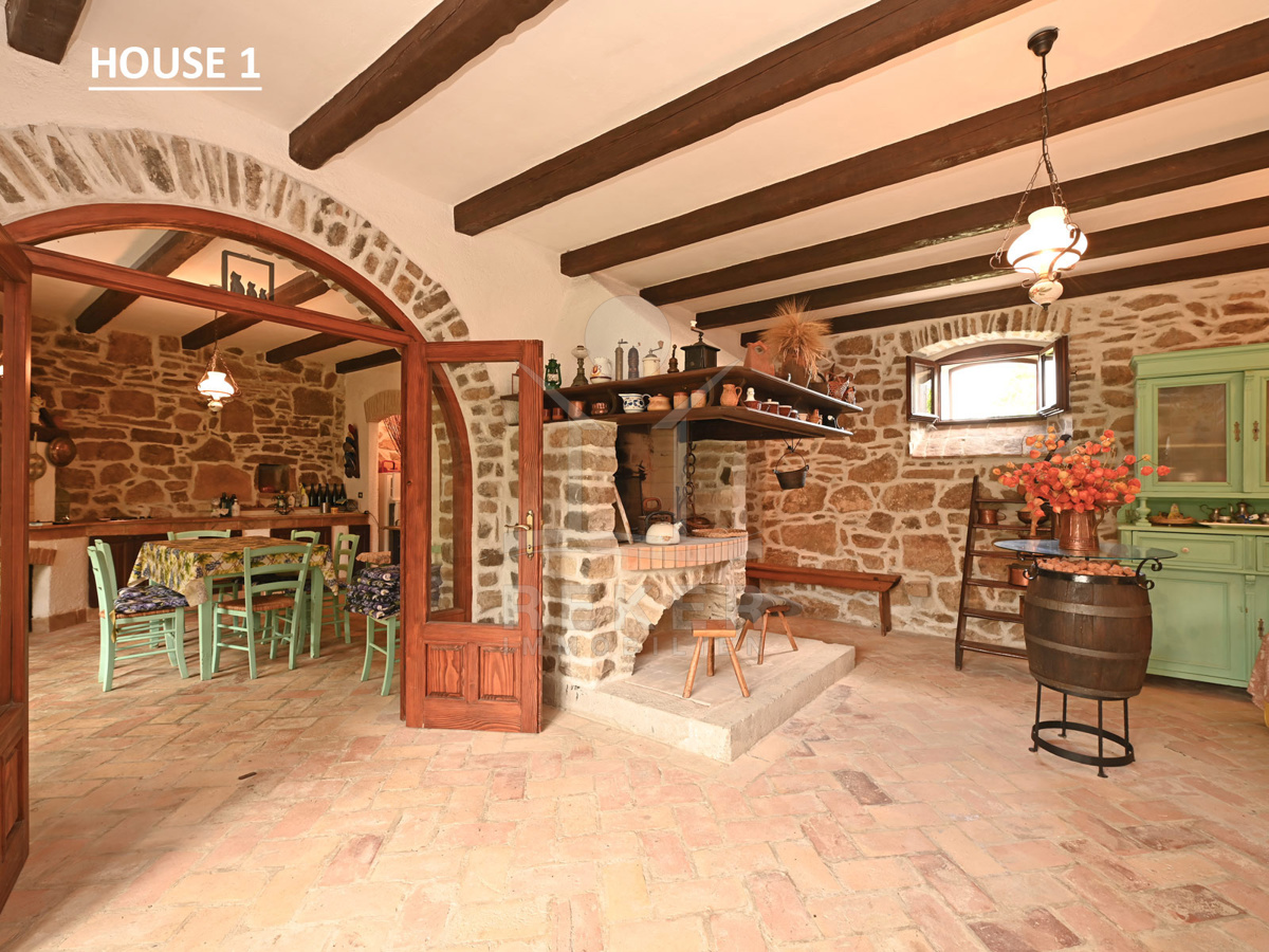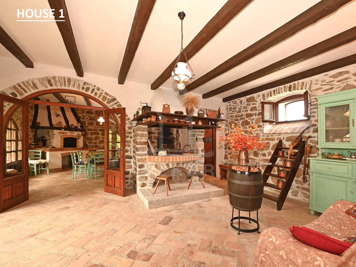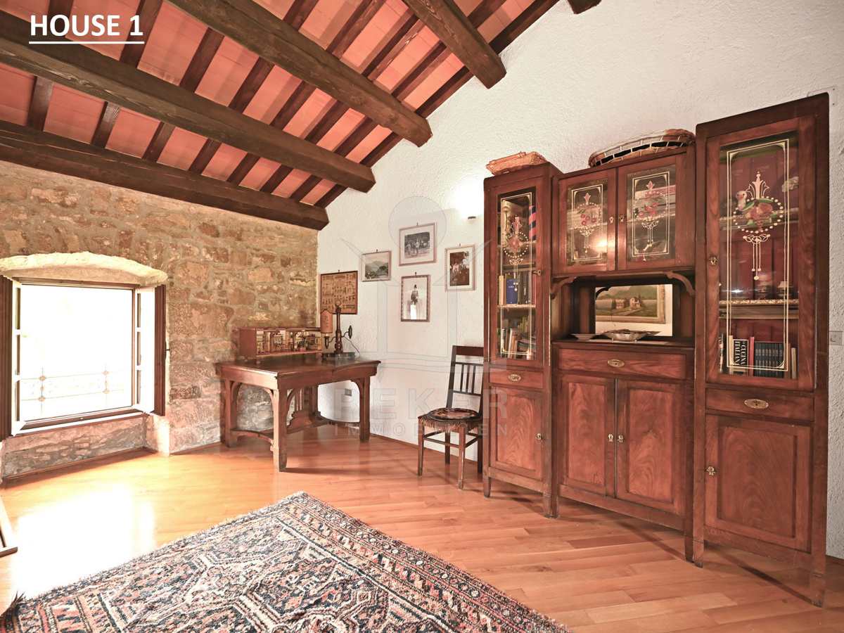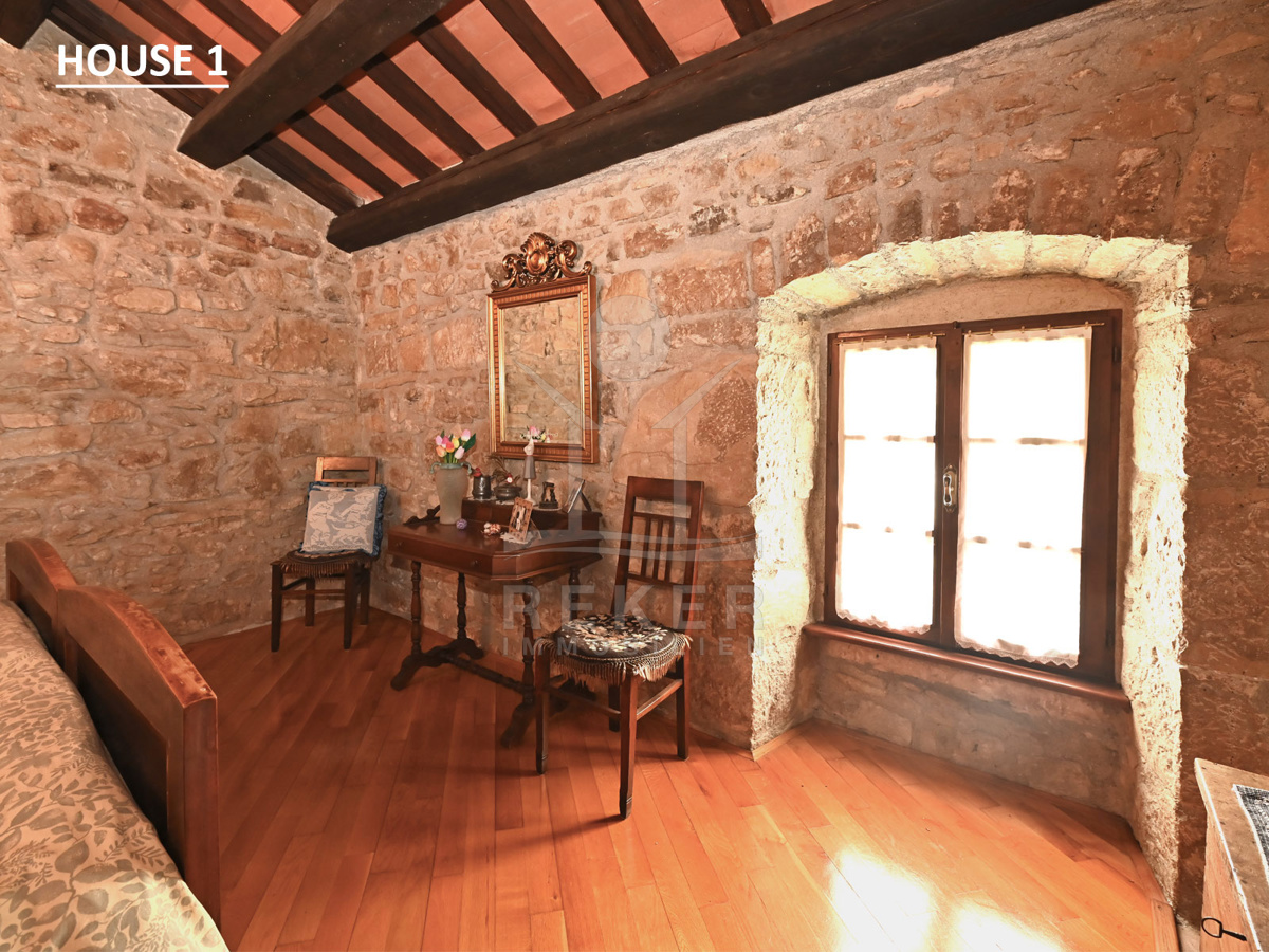 Dieses Anwesen liegt in einem kleinen, abgeschiedenen Weiler in der Nähe von Lupoglav – mitten im Grünen, aber gut angebunden. Zur Küste sind es nur 30 Minuten, zur Autobahn 15. Und genau hier, zwischen Feldern, Wiesen und dem Učka-Massiv, verbirgt sich ein echtes Stück Istrien: Ein Ensemble aus vier Gebäuden mit Geschichte, Charakter und großem Potenzial. Der Fluss Boljunčica fließt in der Nähe – manchmal still, manchmal lebendig. Hier leben Sie mit der Natur, nicht neben ihr.