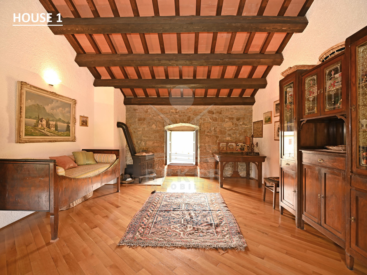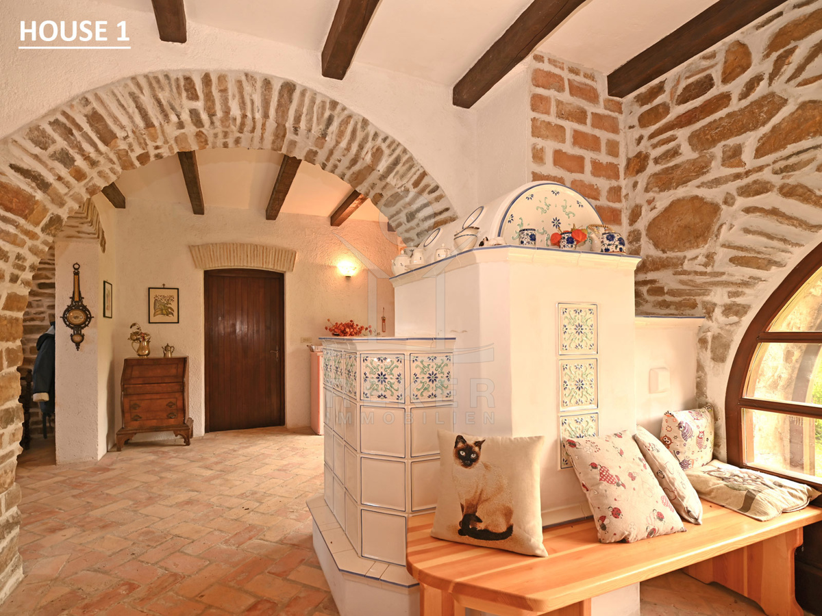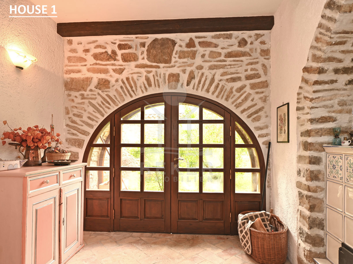 Ein schmiedeeisernes Tor führt in den geschützten Innenhof. Alte Steinmauern, grüne Ranken, Rosen und ein Hauch von Mittelmeer. Alles wirkt gepflegt und einladend – wie aus einem anderen Jahrhundert. Rundherum: über 34.000 m² Fläche, davon 1.100 m² als Bauland. Wer will, kann hier etwas Großes schaffen: ein kleines Feriendorf, ein Ort für Rückzug oder ein besonderes Agrotourismus-Konzept. Die ruhige Lage, das offene Land und die gewachsene Substanz machen fast alles möglich.