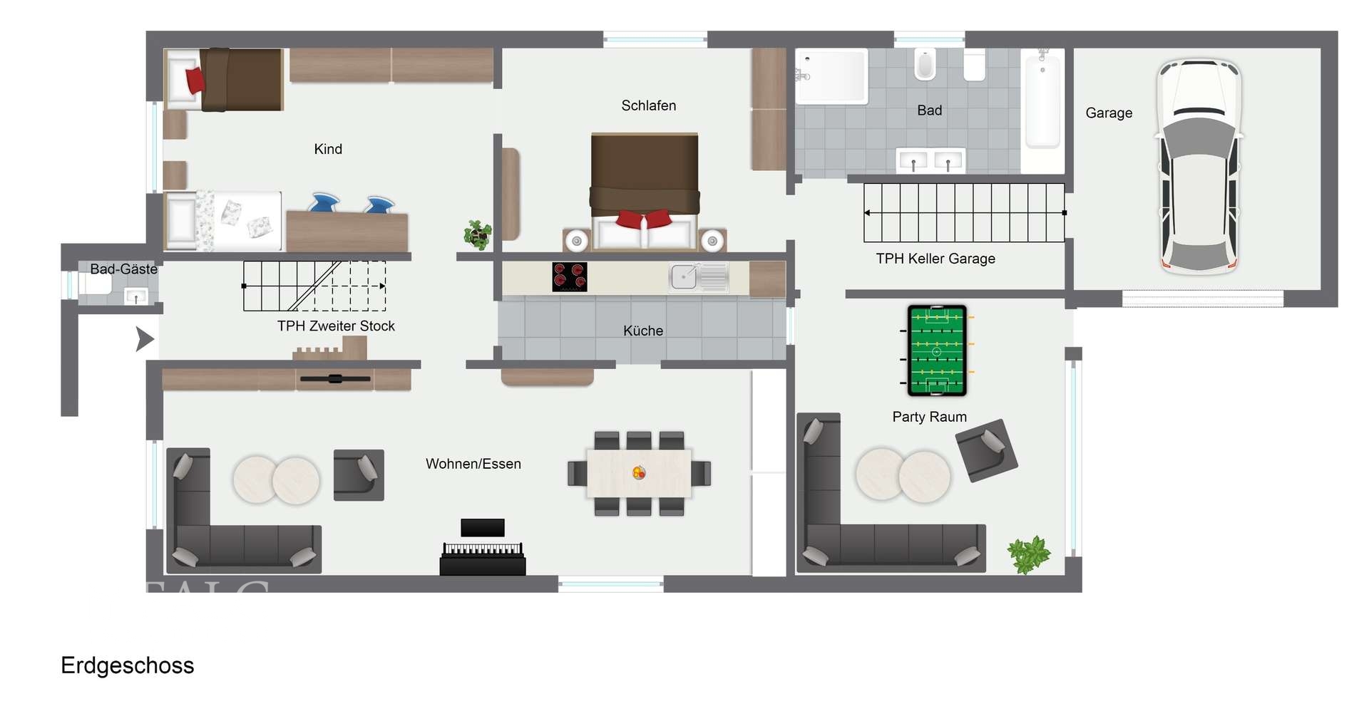 Erdgeschoss - Windfang - Treppenaufgang zum Obergeschoss - Wohn- und Esszimmer - Kinderzimmer - Schlafzimmer - Küche - Bad mit Wanne, Dusche und Fenster - Partyraum - Zugang zu Garage und Keller