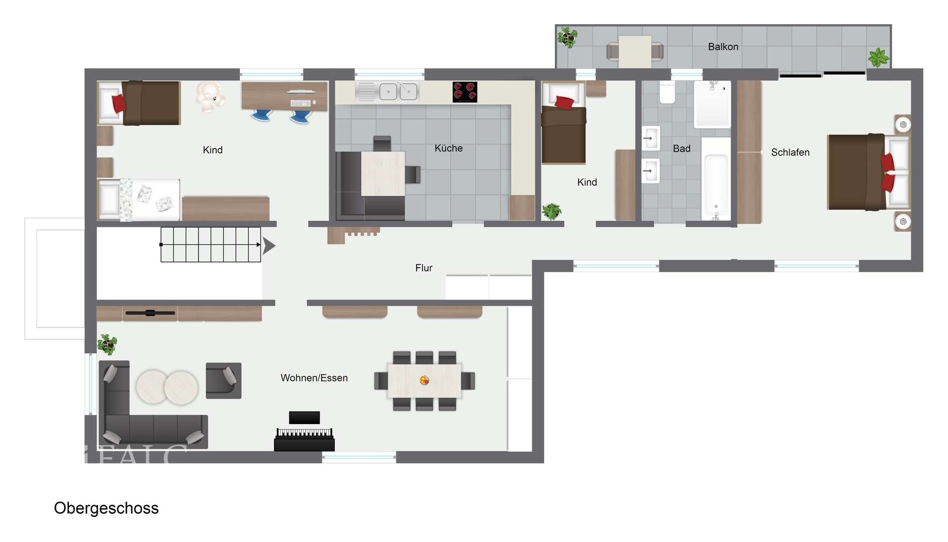 Obergeschoss - Treppenhaus / Flur / Diele - Kinderzimmer - Arbeitszimmer - Schlafzimmer - Wohn- und Esszimmer - Küche - Bad mit Wanne und Fenster - Balkon
