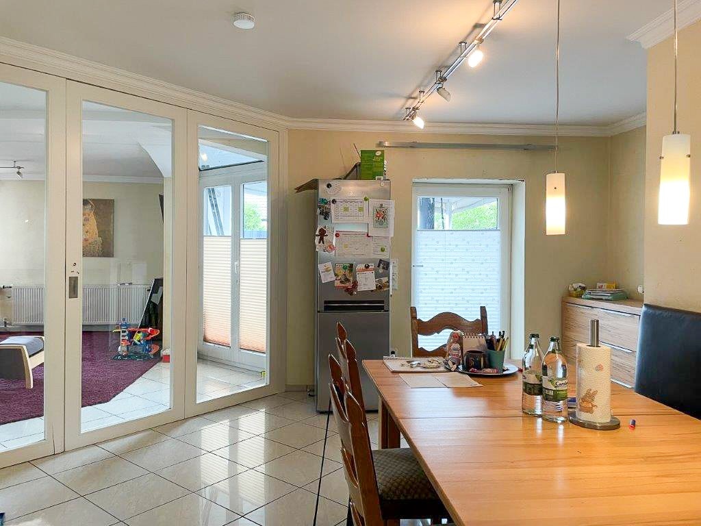 Bereits im Erdgeschoss überzeugt die Raumaufteilung: Der großzügige Wohn- und Essbereich lässt sich durch eine elegante, faltbare Glastür flexibel unterteilen – ideal für unterschiedliche Wohnsituationen. Direkt anschließend befindet sich der offen gestaltete Küchenbereich mit einer maßgefertigten Einbauküche samt hochwertiger Granit-Arbeitsplatte. Die Küche fügt sich harmonisch ins Gesamtbild ein. Der Essbereich öffnet sich zur teils überdachten Terrasse und lädt zu entspannten Stunden im Freien ein – unabhängig vom Wetter. Ein modernes Gäste-Duschbad rundet das Erdgeschoss funktional ab.