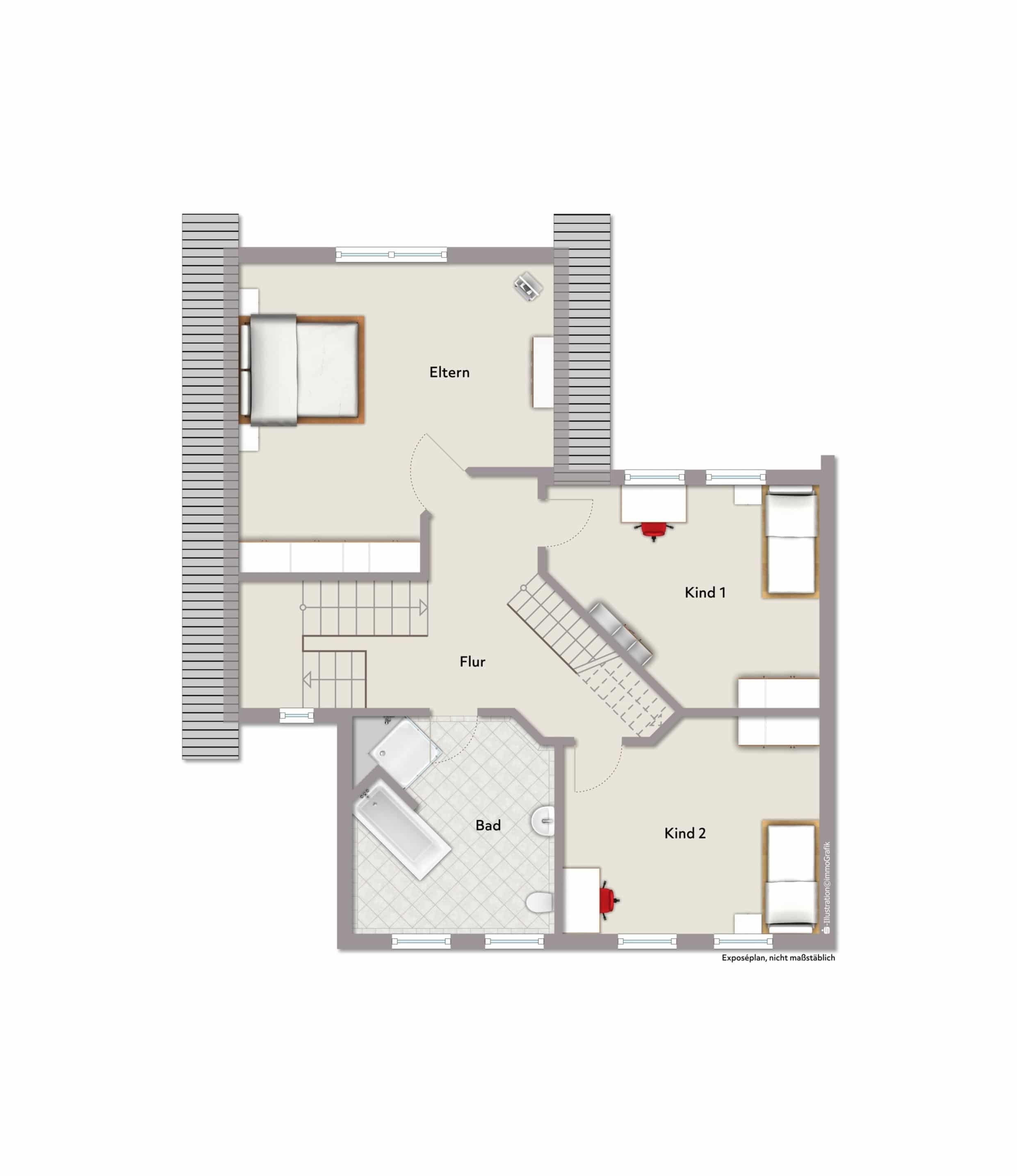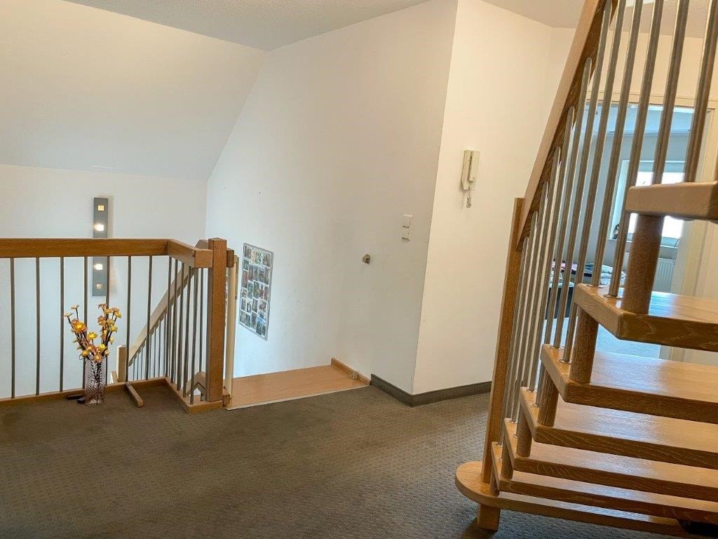 Über eine freitragende Holztreppe gelangt man ins wohnlich ausgebaute Dachgeschoss, das zusätzliche Nutzfläche bietet und sich flexibel als Homeoffice, Hobbyraum oder Rückzugsort nutzen lässt.