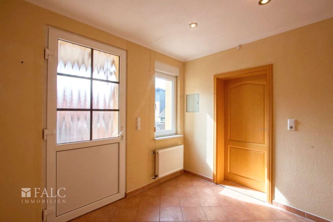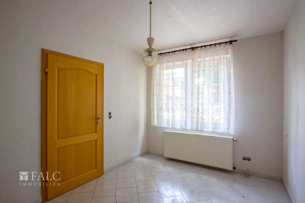 Beim Betreten der 202 m², verteilt auf sechs Zimmer, entscheiden Sie sich zwischen dem straßenseitigen Eingang oder dem entspannten Zugang über den Hof und die sonnige Terrasse. Der langgestreckte Flur im Erdgeschoss führt von der Straßenseite aus rechter Hand in ein helles Wohnzimmer im Anbau, von dem aus sich der Zugang zur Terrasse öffnet. Ebenfalls im Erdgeschoss liegen ein weiteres Zimmer sowie eine geräumige Küche mit genügend Platz für einen Essbereich. Es schließt sich ein gefliestes Badezimmer mit Wanne an.
