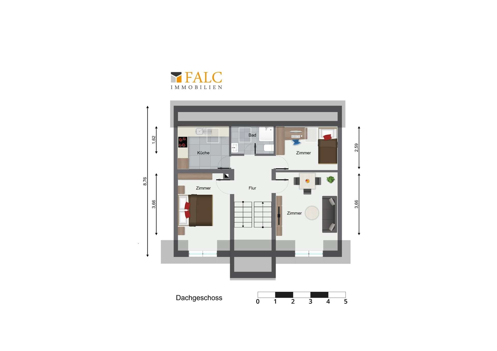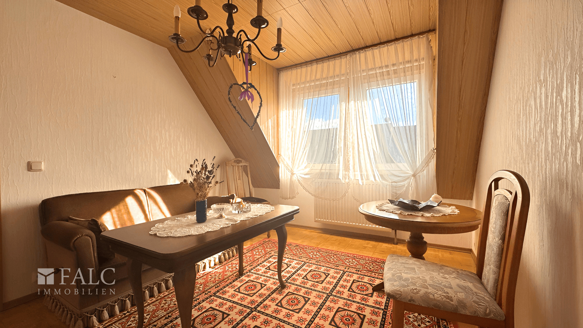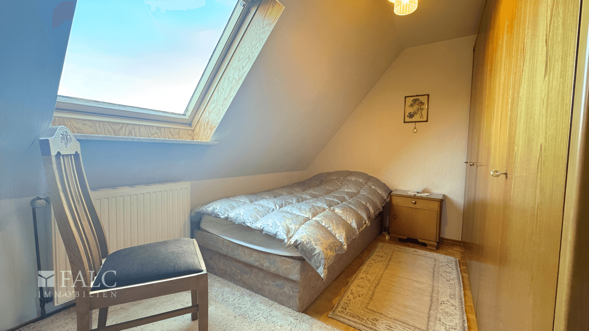 In den oberen Etagen stehen weitere Räume zur Verfügung, die als Schlaf-, Kinder-, Arbeits- oder Gästezimmer genutzt werden können. Insgesamt bietet das Haus acht Zimmer und damit reichlich Platz für individuelle Lebenskonzepte. Im Dachgeschoss befindet sich ein weiteres Badezimmer, ebenfalls mit Badewanne, das sich ideal als separates Eltern- oder Kinderbad anbietet. Die Raumaufteilung schafft Privatsphäre und Flexibilität für jedes Familienmitglied.