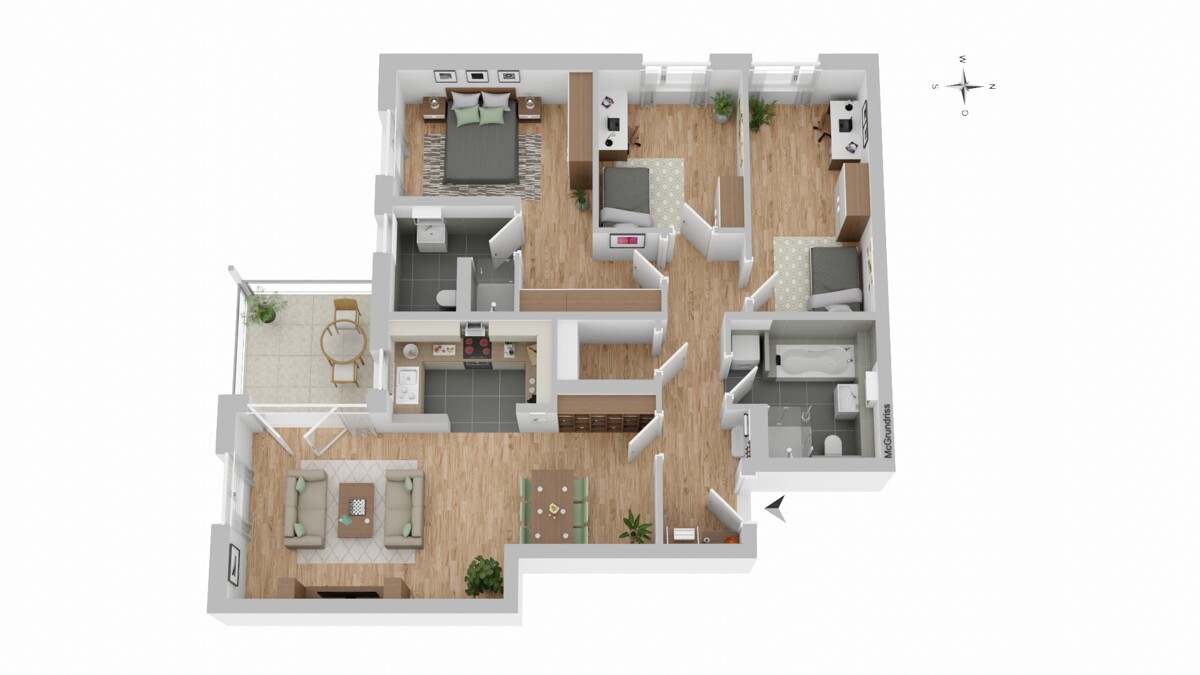 Der lichtdurchflutete Wohn- und Essbereich bildet das Herzstück der Wohnung. Das Schlafzimmer die beiden weiteren Zimmer sind ideal für Gäste, Homeoffice oder Hobbyräume. Die Küche ist praktisch an das Wohnzimmer angeschlossen.