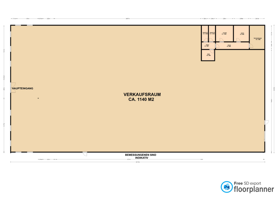 * Sanitäranlagen: Getrennte WC-Einheiten für Besucher und Personal *Aufenthalts- & Pausenräume: Eine Teeküche oder Pausenraum fördert die Motivation und dient als Rückzugsort für das Team *Lager & Technik: Flächen für Ausstellungsmaterial, Reinigungsequipment und die Haustechnik (Heizung/Lüftung)