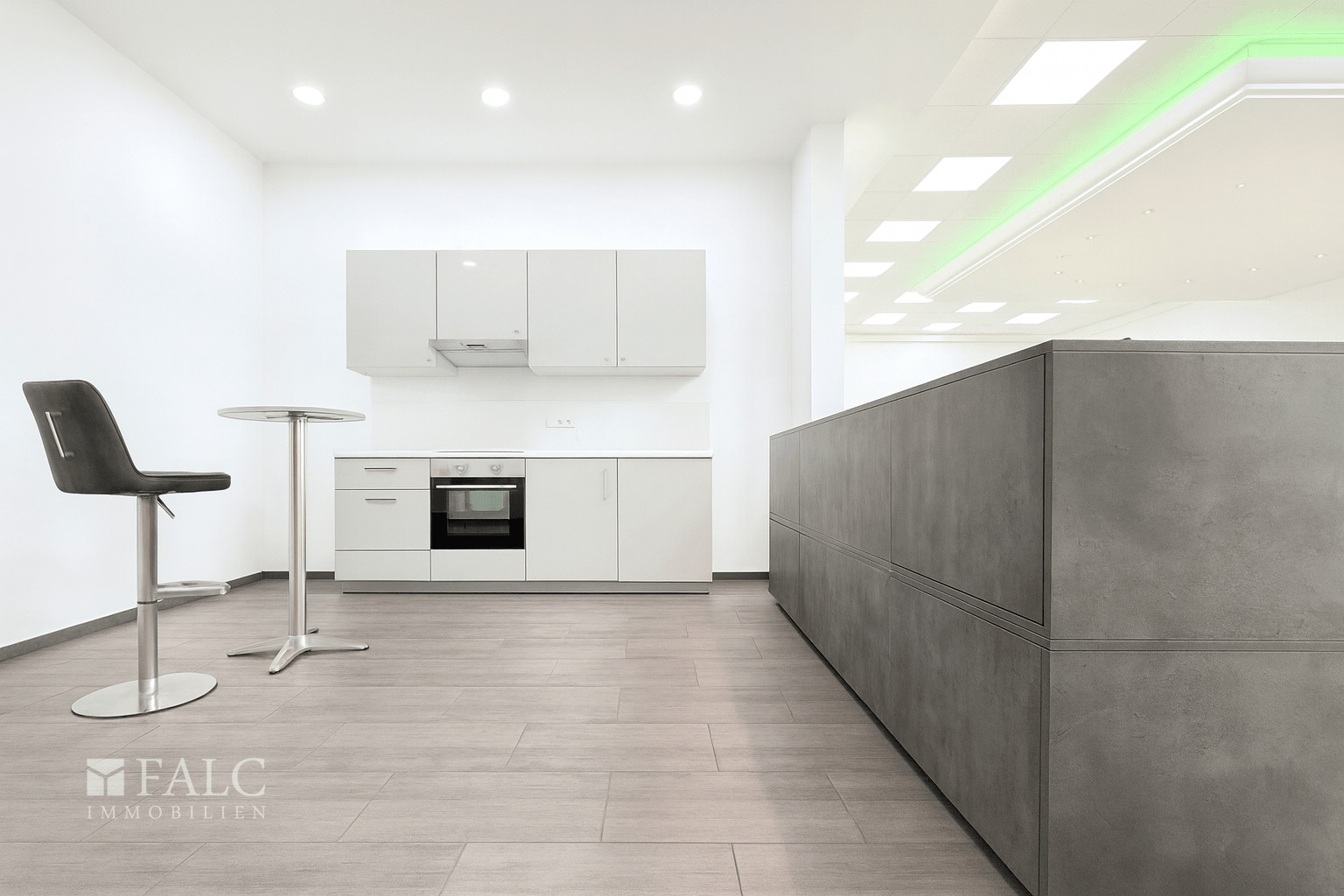 Der Empfangsbereich bietet einen professionellen ersten Eindruck für Kunden und Geschäftspartner und leitet nahtlos in den großzügigen Showroom über. Dieser eignet sich ideal zur Präsentation von Produkten oder Dienstleistungen und unterstreicht die repräsentative Wirkung des Objekts. Ergänzt wird die Bürofläche durch eine offen gestaltete Küche, die sich zentral im Gebäudekern befindet und direkt vom Konferenzraum aus zugänglich ist. Dadurch entstehen kurze Wege, die eine kommunikative und einladende Atmosphäre fördern.