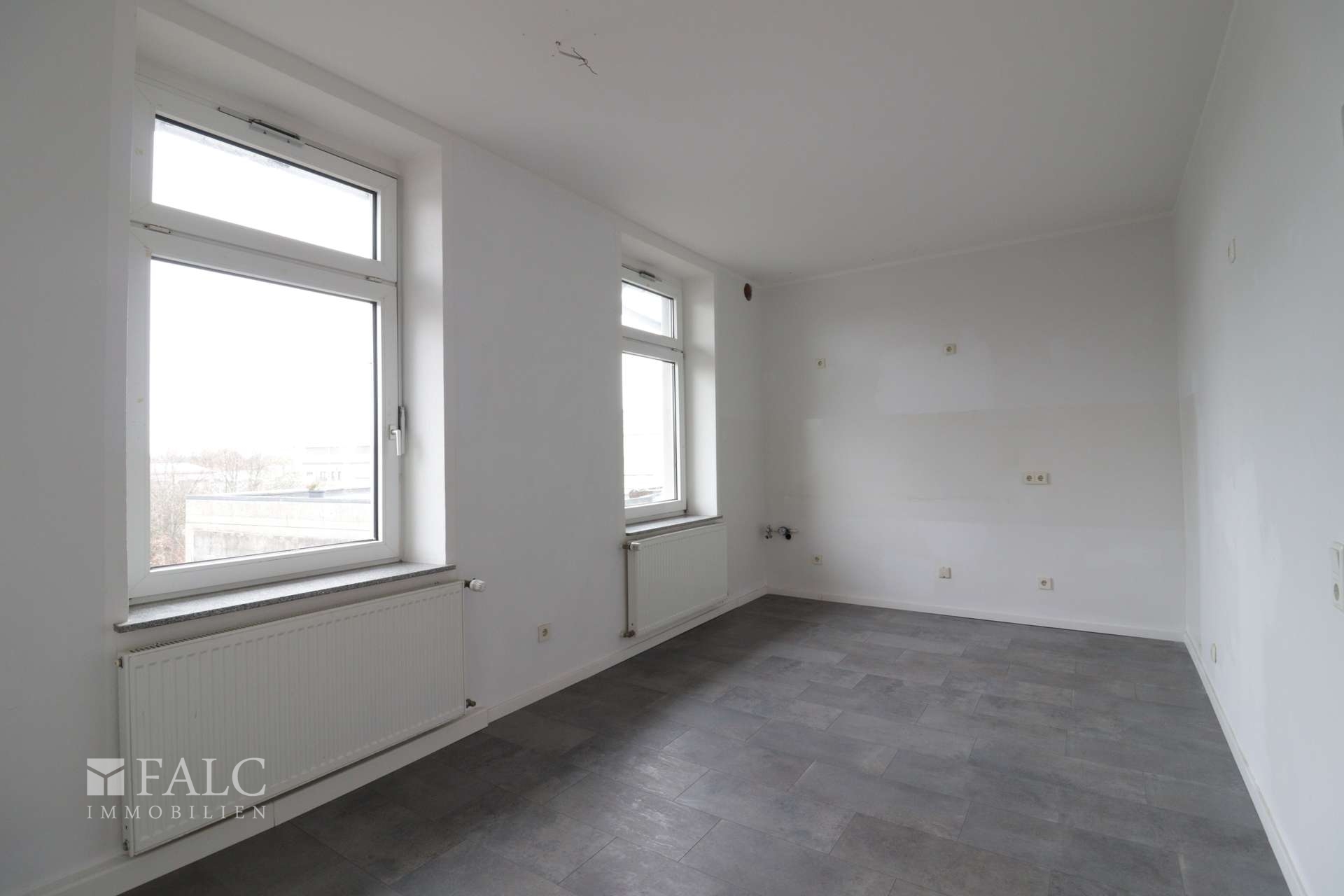 Von hier aus öffnet sich die großzügige, lichtdurchflutete Wohnküche – das wahre Herzstück dieser Wohnung. Dank der großen Fenster strömt tagsüber viel natürliches Licht hinein und schafft eine angenehm freundliche Atmosphäre. Hier lässt sich ein schöner Mittelpunkt des Alltags gestalten: ein gemütlicher Essplatz, ein offener Kochbereich ganz nach Ihrem Geschmack und vielleicht eine kleine Sitzecke für entspannte Morgenstunden. Da keine Einbauküche vorhanden ist, genießen Sie völlige Freiheit in der Gestaltung – ideal für alle, die sich ihre ganz persönliche Traumküche einrichten möchten.