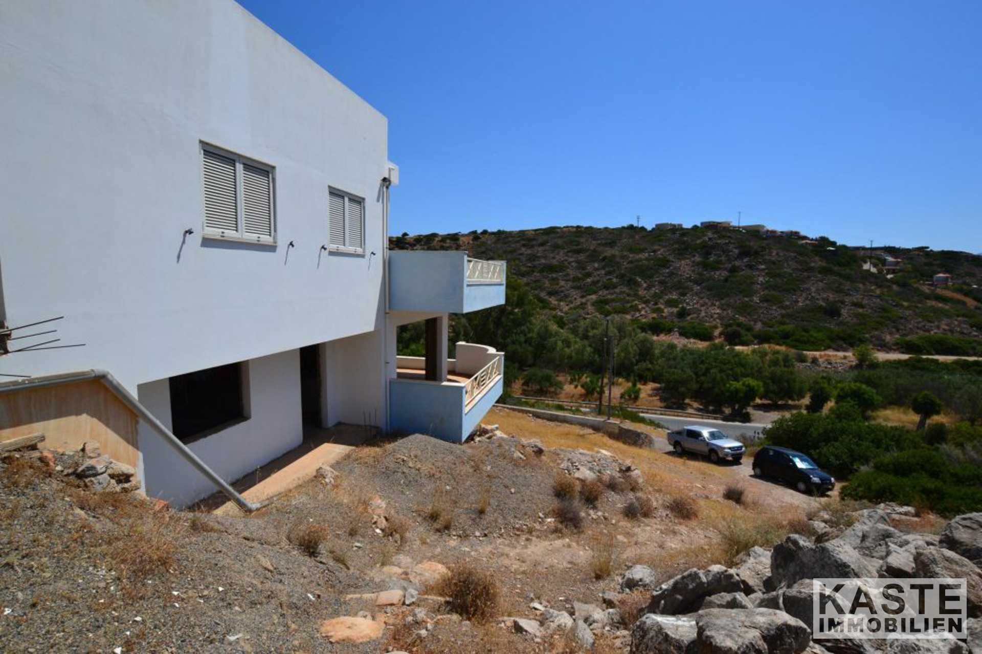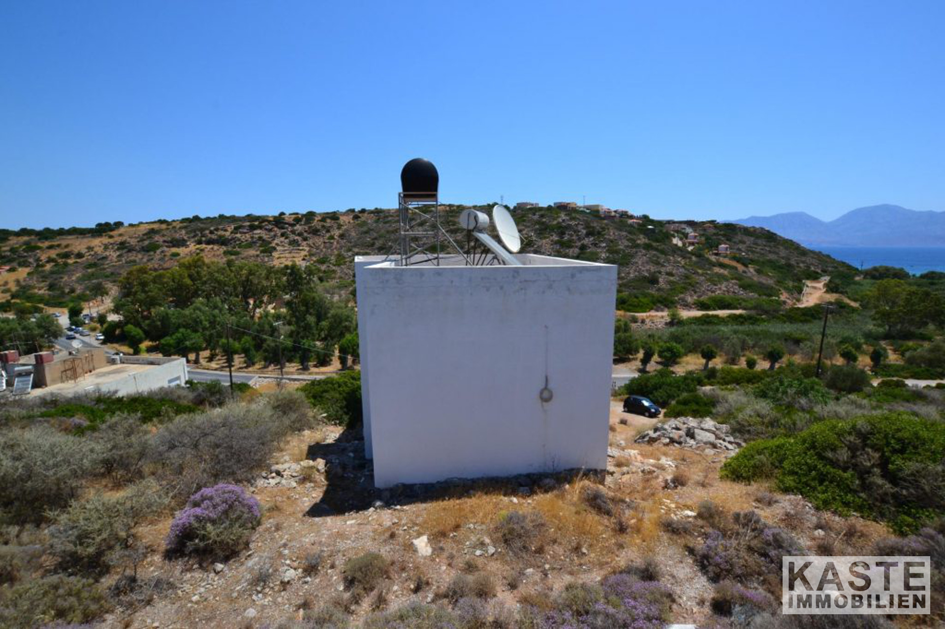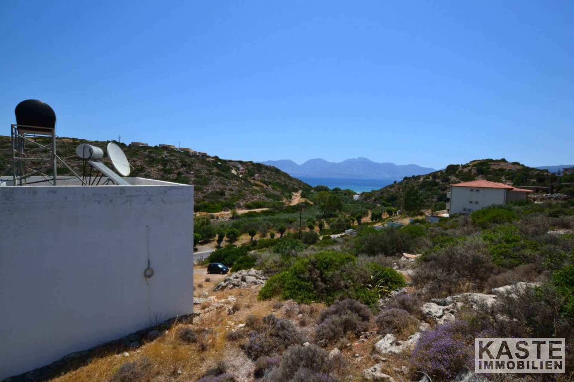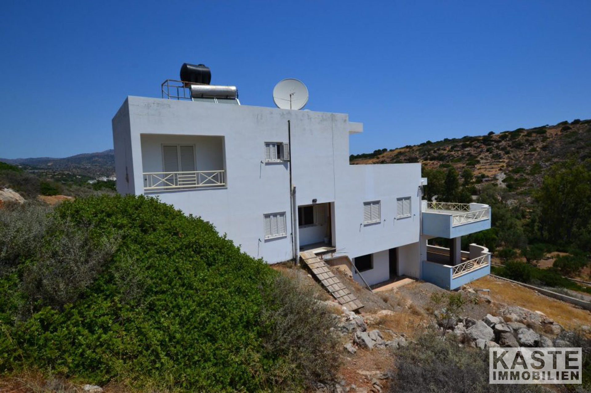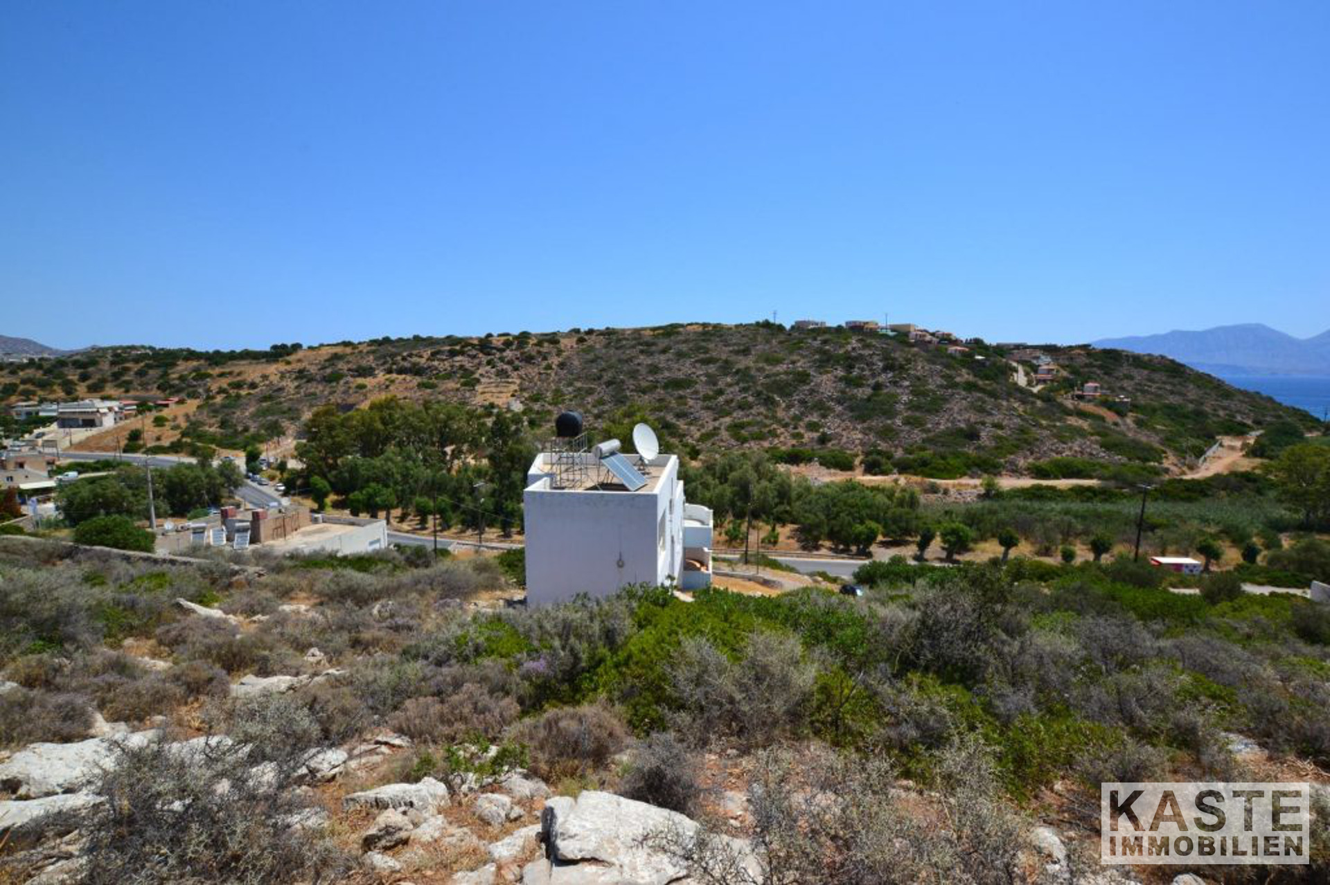 Die Hauptvilla umfasst im Erdgeschoss einen offenen Wohnbereich mit Esszimmer und Küche mit direktem Zugang zu einer geräumigen Terrasse, die einen herrlichen Meerblick mit Blick auf den Strand von Almyros bietet. Auf der gleichen Etage befinden sich auch zwei Doppelschlafzimmer mit Einbauschränken und ein großes Badezimmer mit Badewanne.
