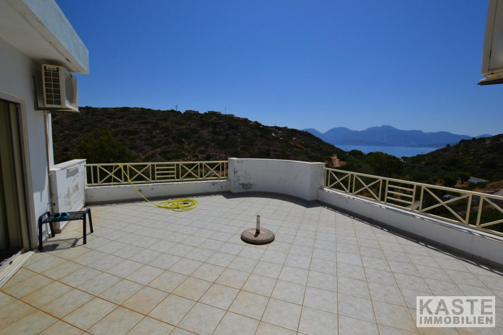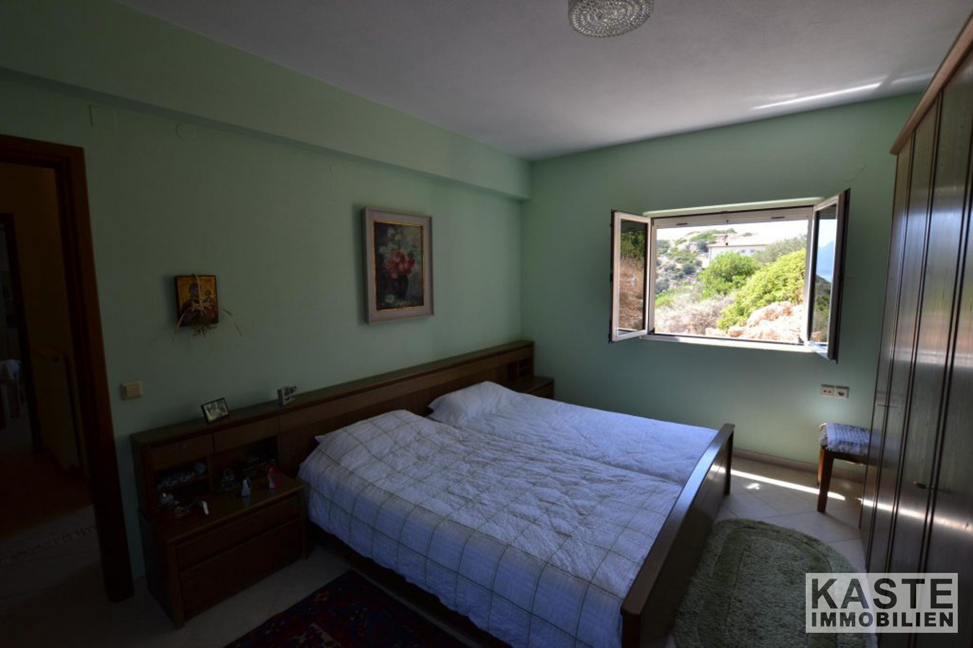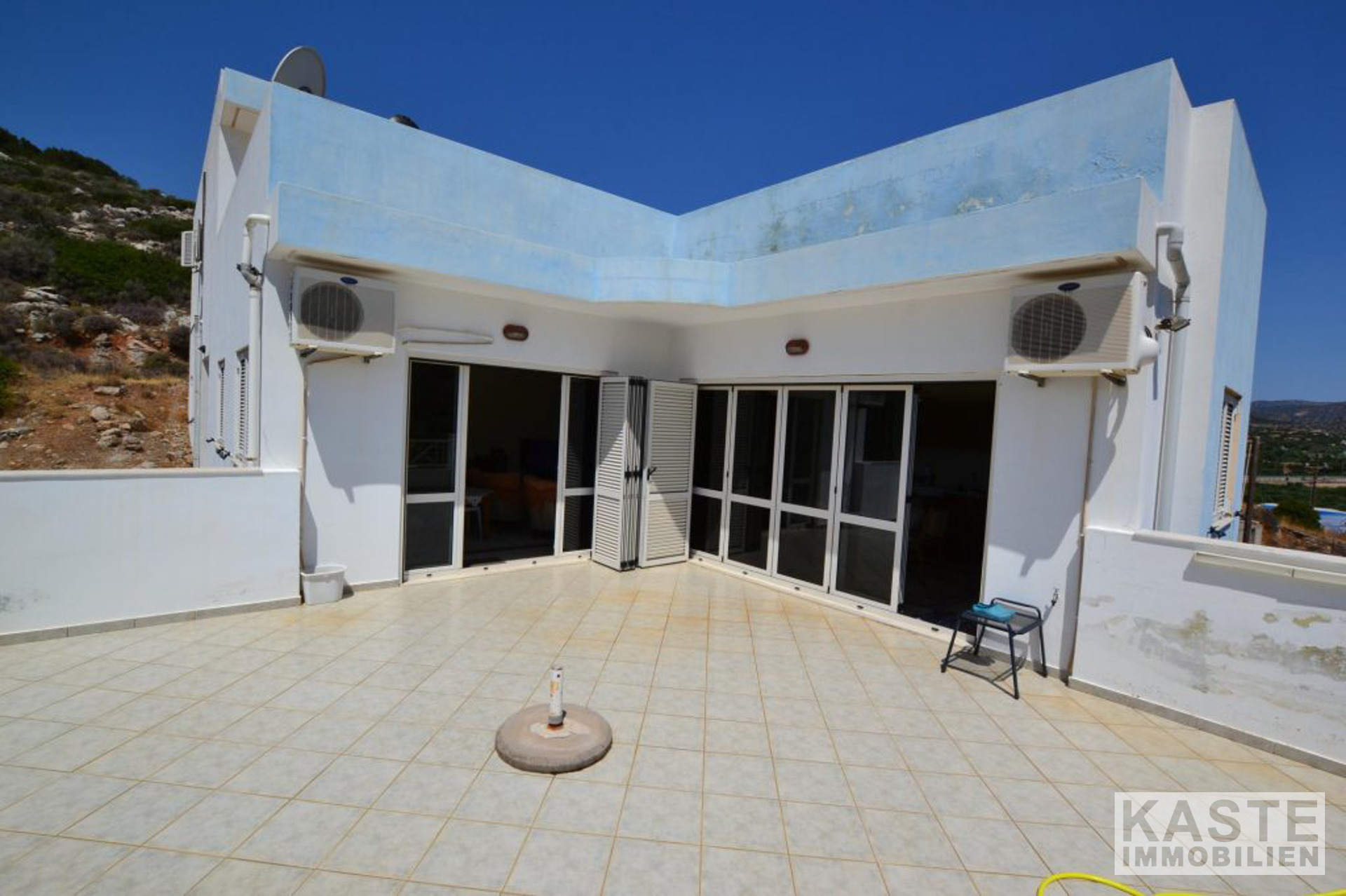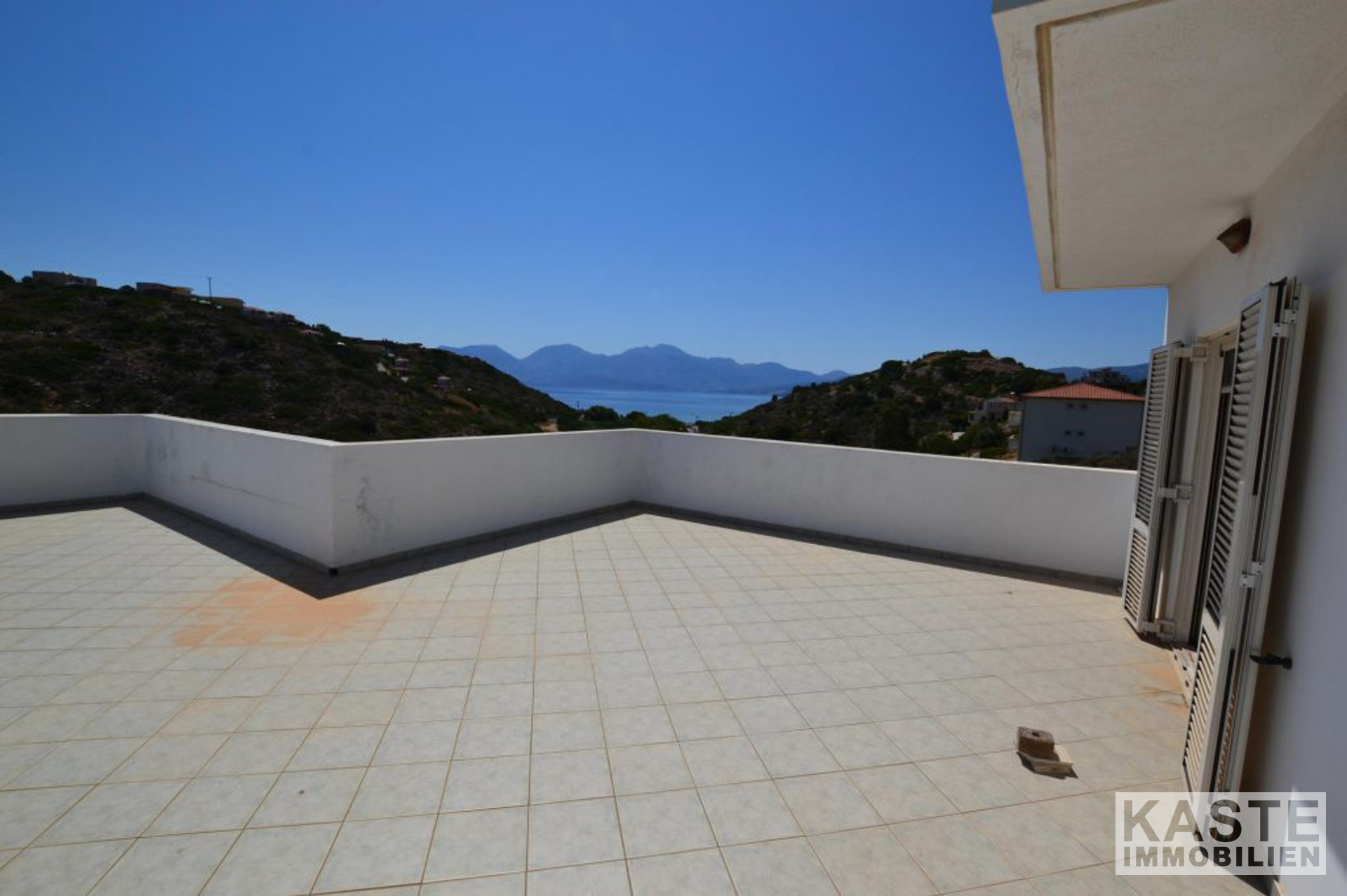 Die Hauptvilla umfasst im Erdgeschoss einen offenen Wohnbereich mit Esszimmer und Küche mit direktem Zugang zu einer geräumigen Terrasse, die einen herrlichen Meerblick mit Blick auf den Strand von Almyros bietet. Auf der gleichen Etage befinden sich auch zwei Doppelschlafzimmer mit Einbauschränken und ein großes Badezimmer mit Badewanne.
