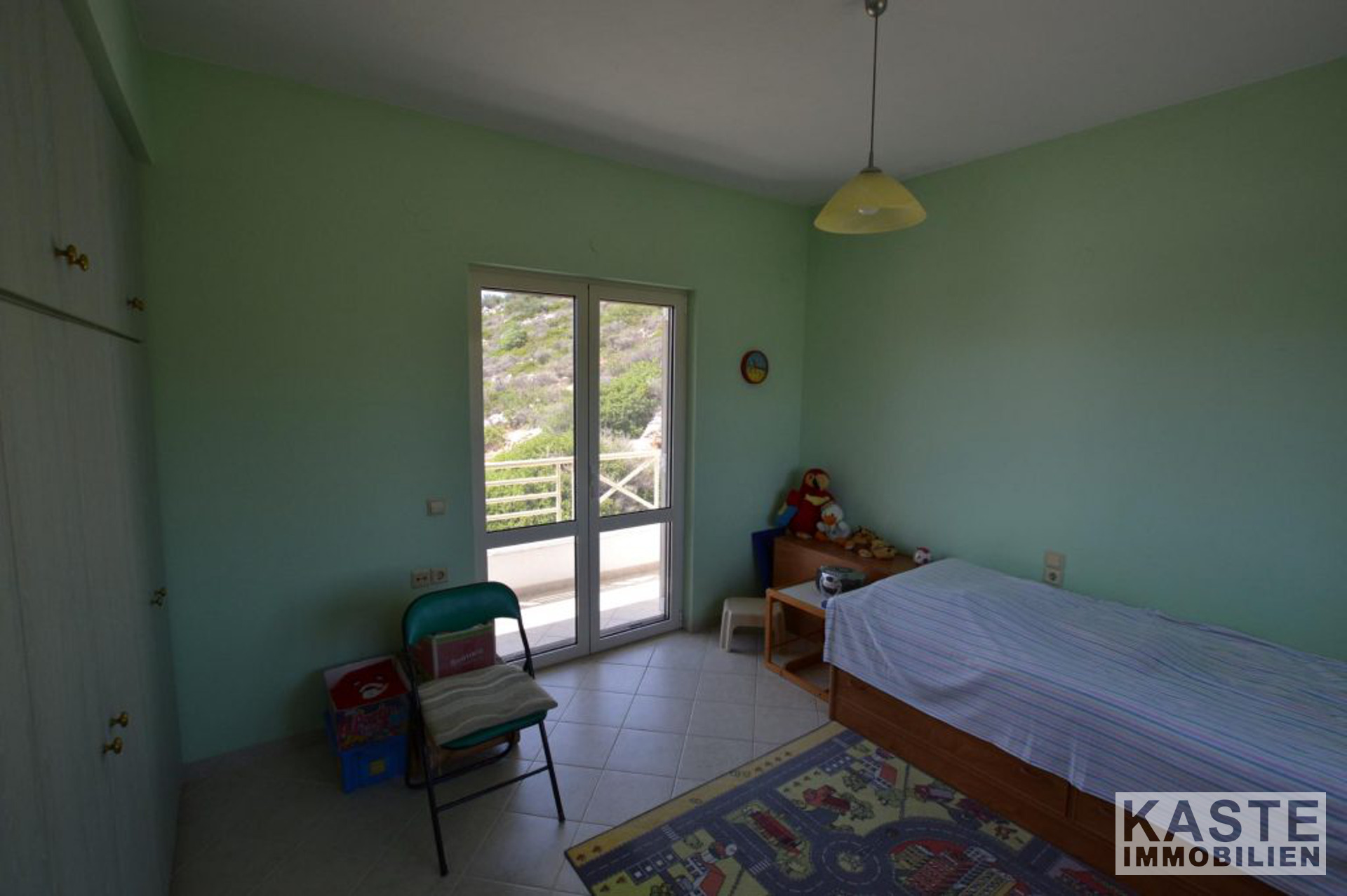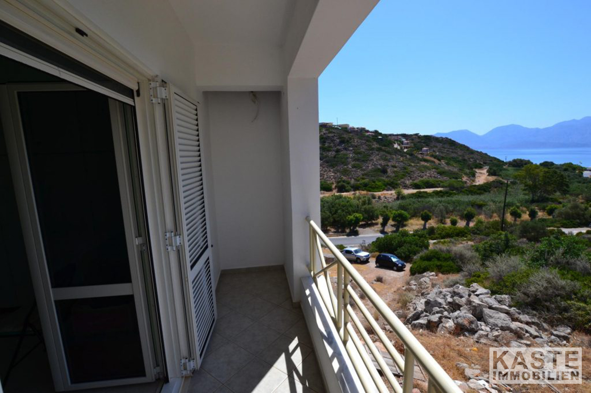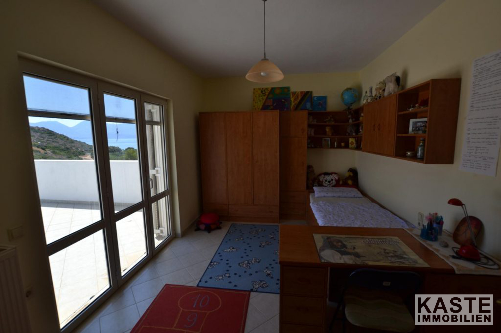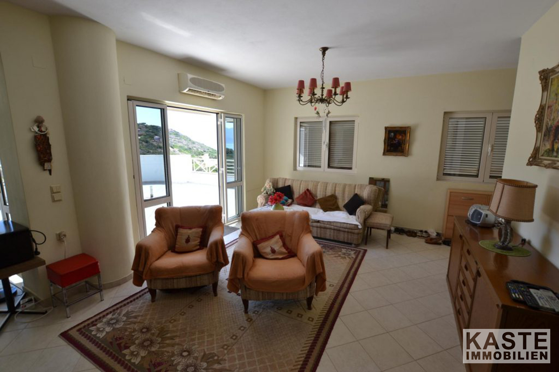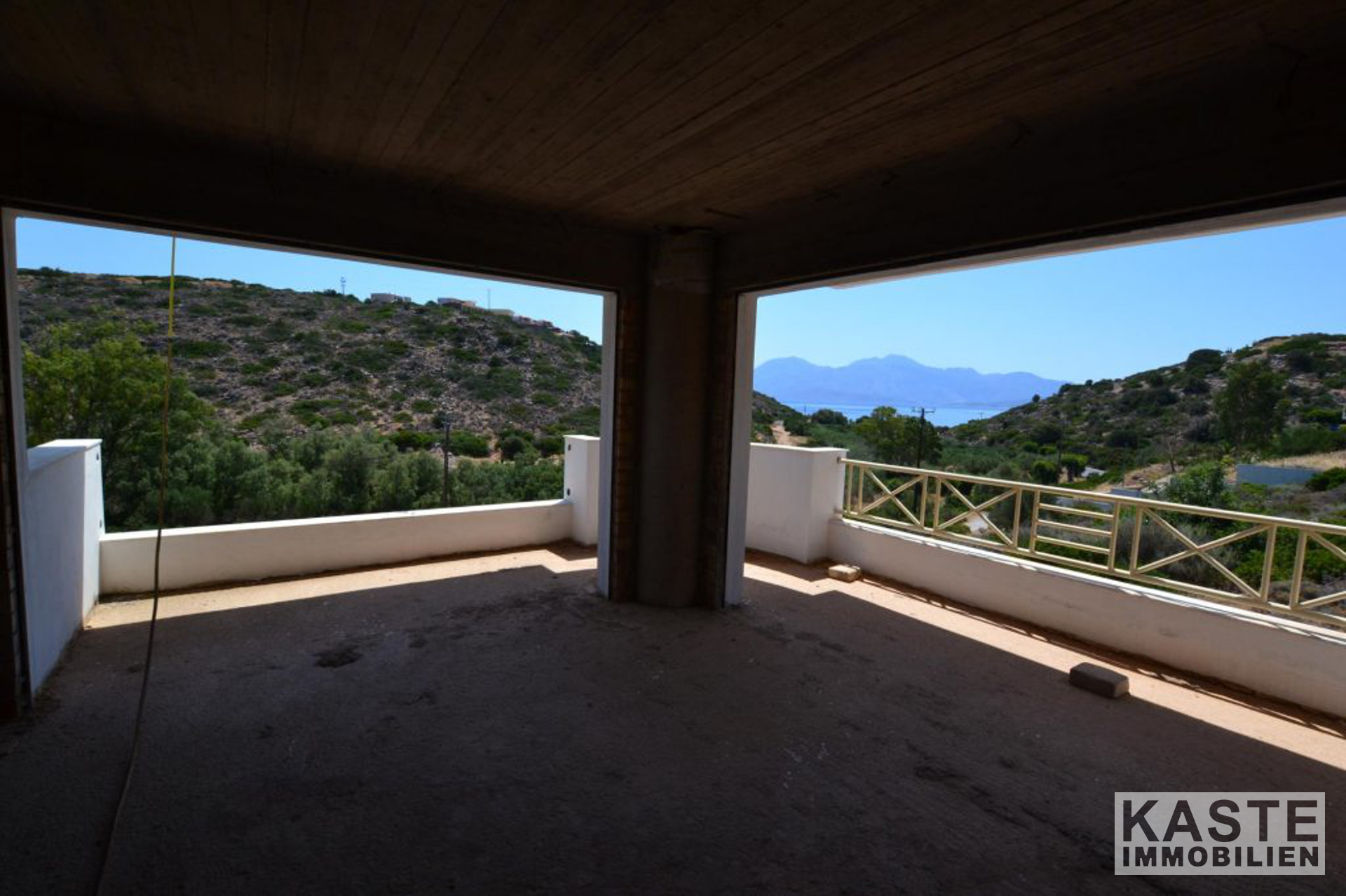 Die Hauptvilla umfasst im Erdgeschoss einen offenen Wohnbereich mit Esszimmer und Küche mit direktem Zugang zu einer geräumigen Terrasse, die einen herrlichen Meerblick mit Blick auf den Strand von Almyros bietet. Auf der gleichen Etage befinden sich auch zwei Doppelschlafzimmer mit Einbauschränken und ein großes Badezimmer mit Badewanne.