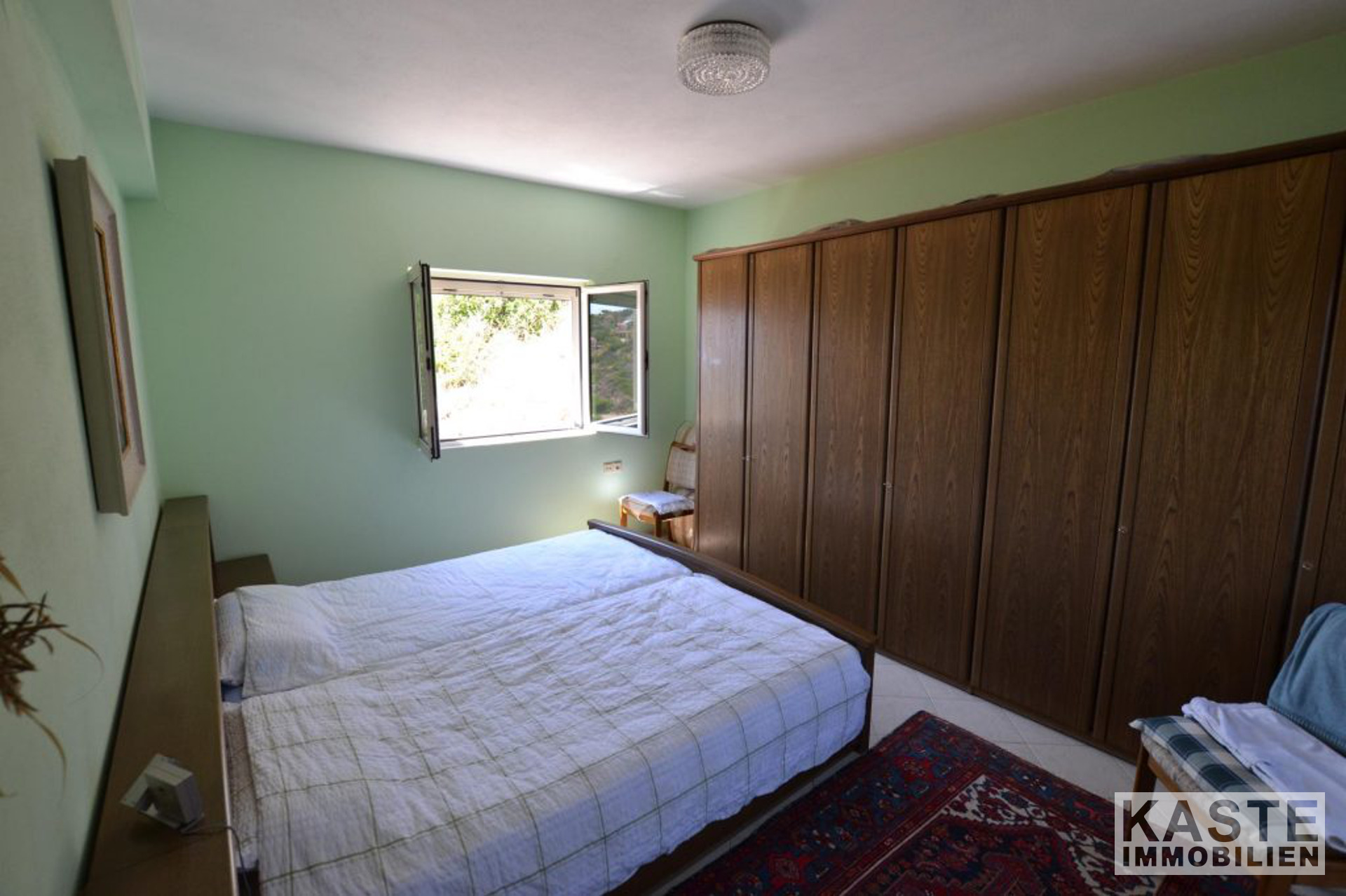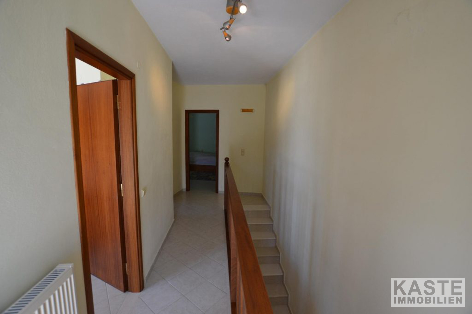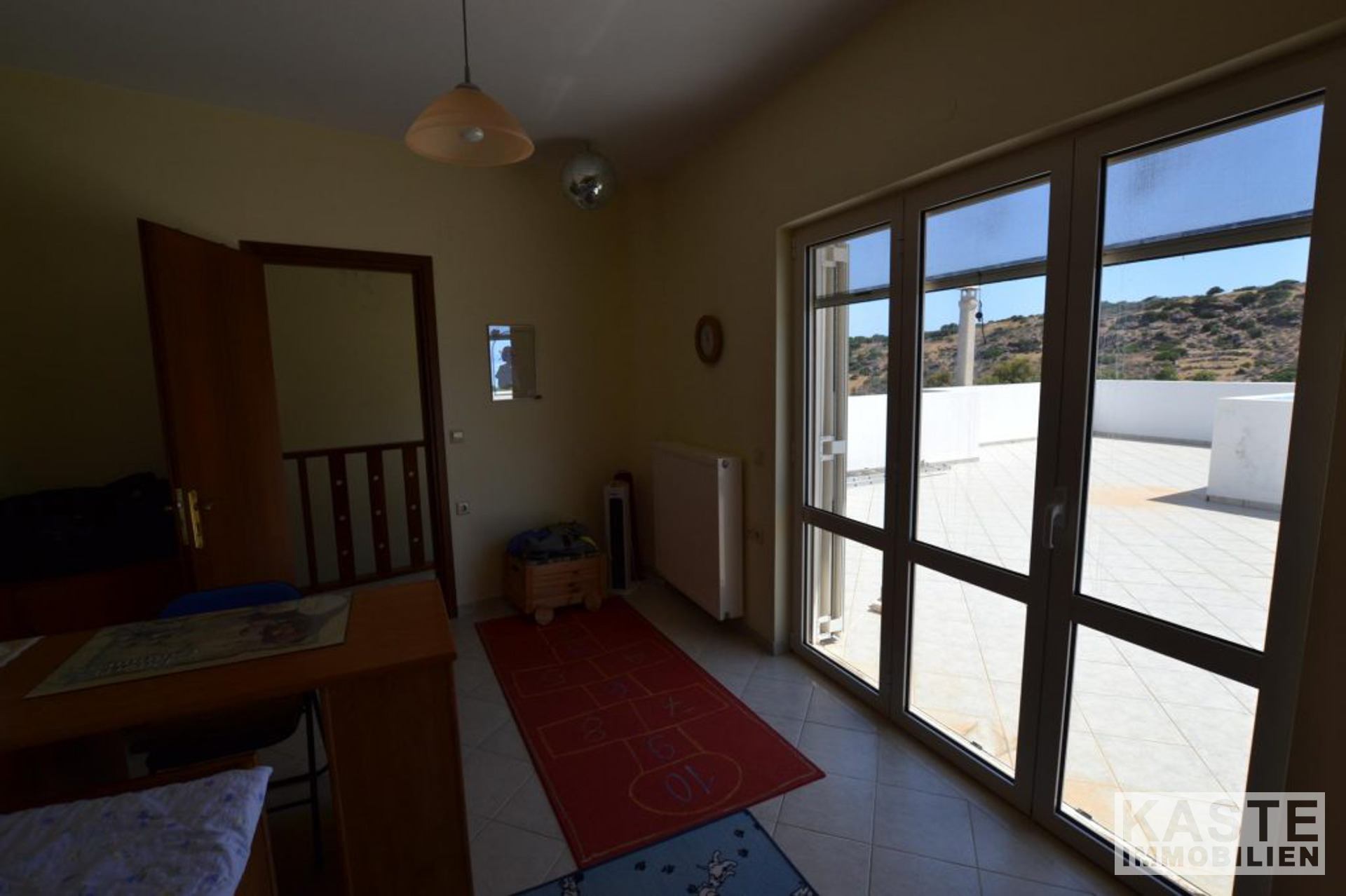Die Treppe hinauf zum obersten Stockwerk gibt es zwei Doppelzimmer mit Einbauschränken, eines der Schlafzimmer hat Aluminium-Balkontüren, die auf die große Terrasse im obersten Stockwerk hinausführen. Auf dieser Ebene gibt es auch ein Gemeinschaftsbad mit Badewanne.