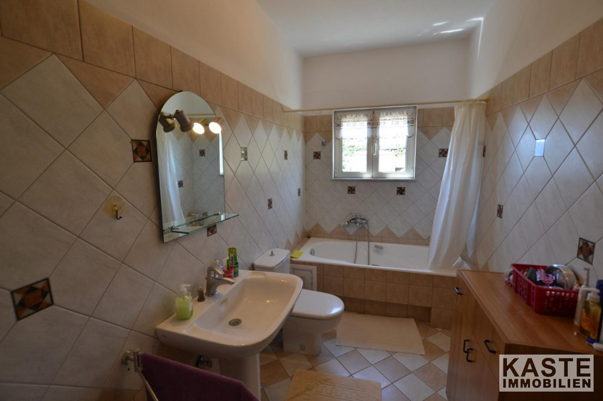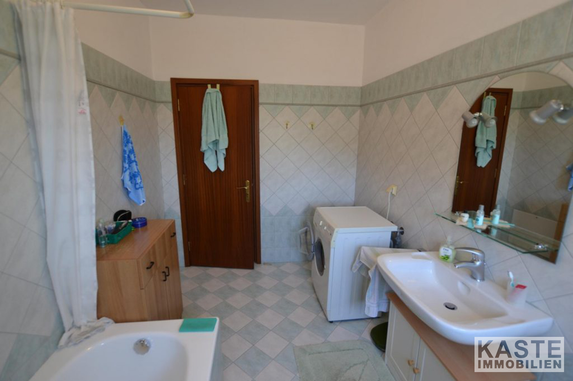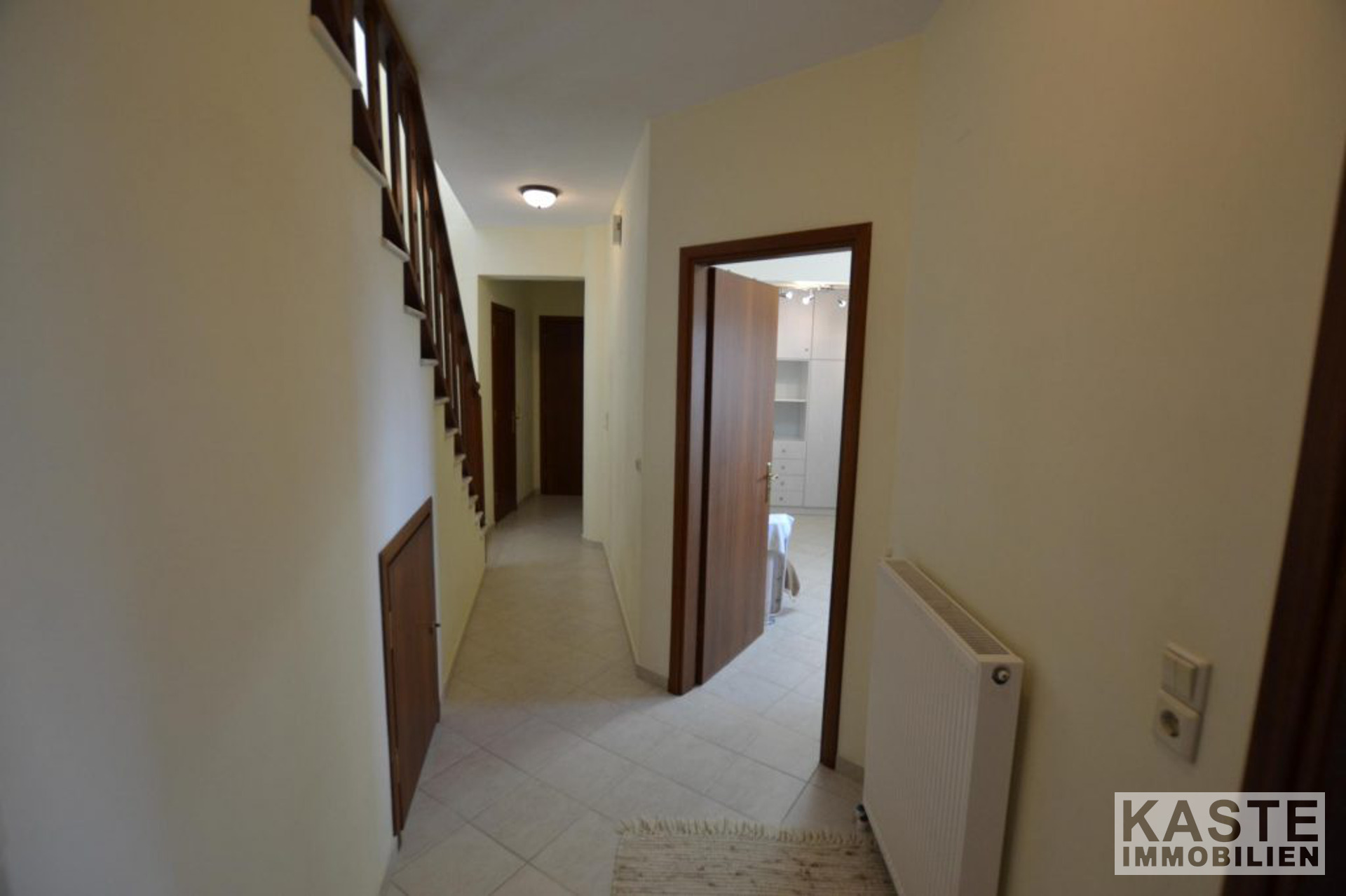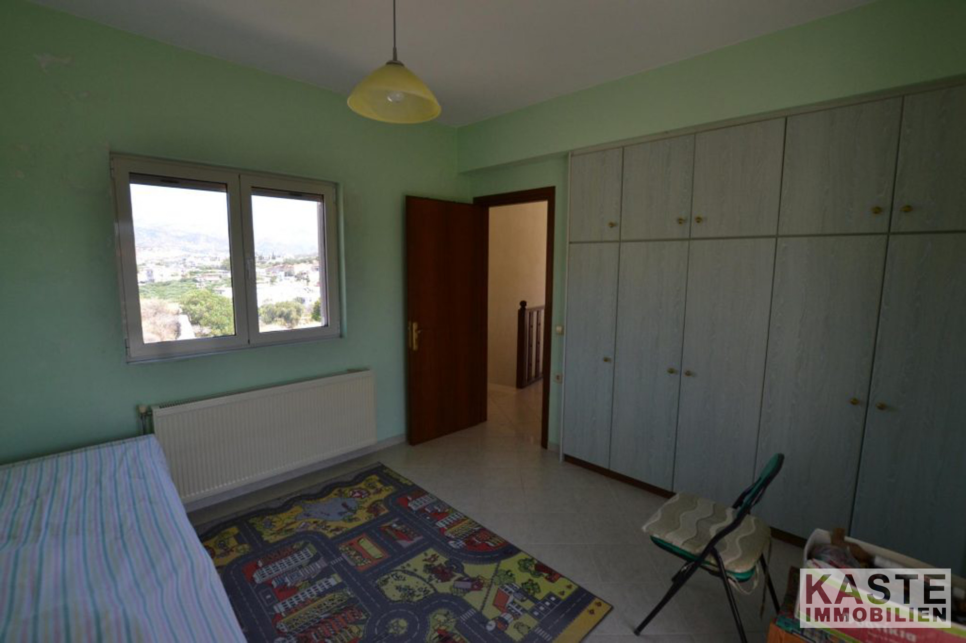 Die Treppe hinauf zum obersten Stockwerk gibt es zwei Doppelzimmer mit Einbauschränken, eines der Schlafzimmer hat Aluminium-Balkontüren, die auf die große Terrasse im obersten Stockwerk hinausführen. Auf dieser Ebene gibt es auch ein Gemeinschaftsbad mit Badewanne.