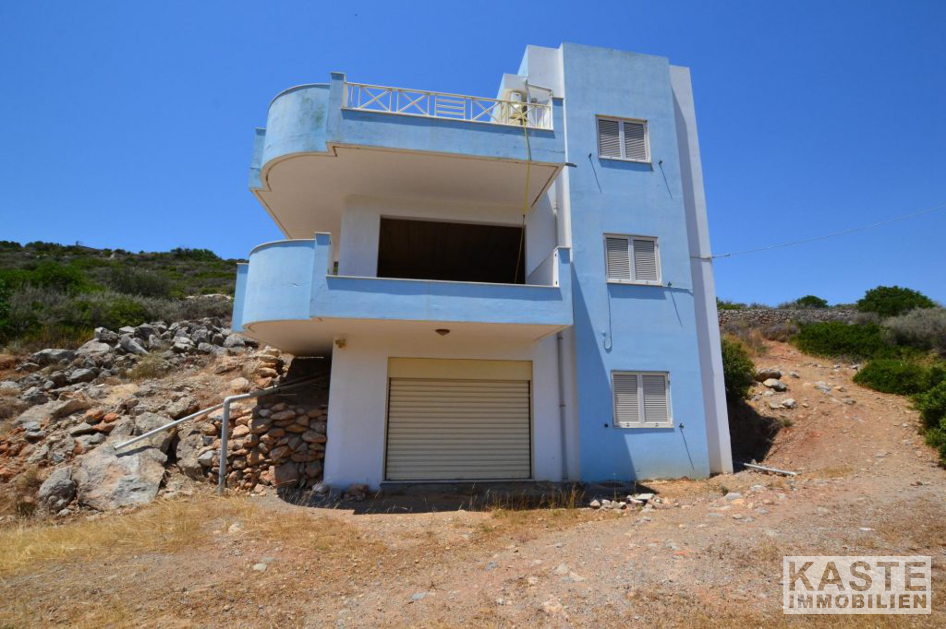 Dieses große Anwesen befindet sich nur 1 km von der Stadt Agios Nikolaos und weniger als 500 m vom wunderschönen Sandstrand von Almyros entfernt. Das Gebäude hat eine Gesamtfläche von 350m2 auf 4 Stockwerken. Die 4-Schlafzimmer-Hauptvilla von etwa 165m2 (113m2 + 52m2) besteht aus den beiden obersten Stockwerken. Ein Stockwerk unter der Villa befindet sich eine unfertige Wohnung von ca. 110m2. Diese könnte in eine komfortable 2-Schlafzimmer-Wohnung umgewandelt werden. Im Erdgeschoss befindet sich eine Garage/Abstellfläche von etwa 75m2. Die grundstücksfläche beträgt 4.320 m2.