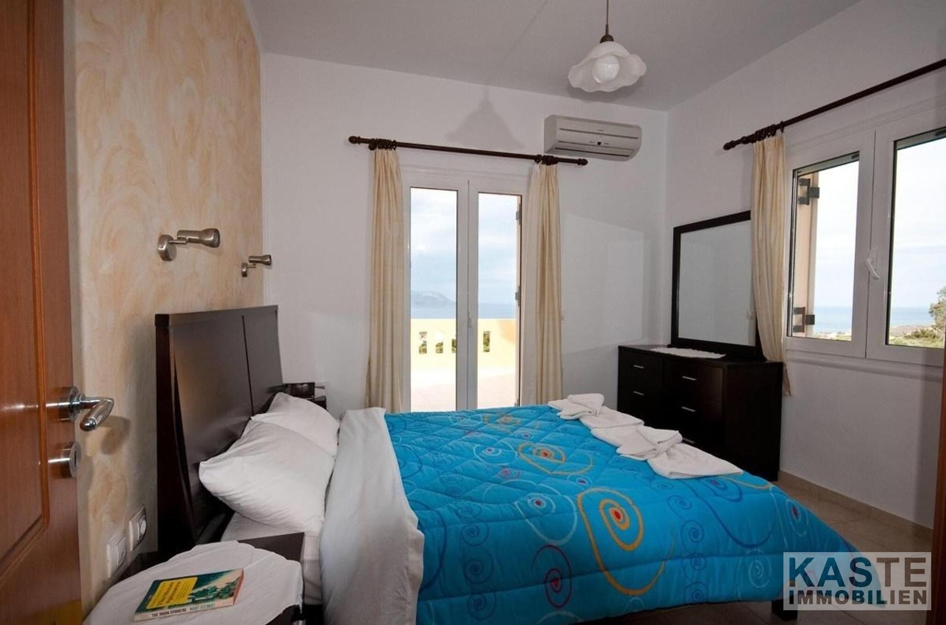 Die erste Etage beherbergt zwei weitere großzügige Schlafzimmer, die mit Einbauschränken ausgestattet sind und Zugang zur weitläufigen Sonnenterrasse bieten. Von hier aus eröffnet sich ein beeindruckender 360-Grad-Blick über die Bucht von Souda und die umliegende Landschaft.