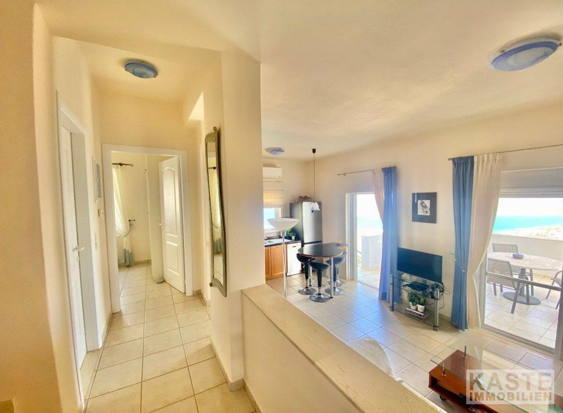Im ersten Stock erwartet Sie der offen gestaltete Wohn- und Essbereich, ergänzt durch eine moderne Küche mit Frühstückstheke. Die nahtlose Verbindung zur großen Hauptterrasse ermöglicht genussvolle Mahlzeiten mit spektakulärem Panorama über das Meer und die umliegende Landschaft. Zwei geschmackvoll eingerichtete Doppelschlafzimmer mit Einbauschränken bieten komfortable Rückzugsorte, wobei eines über ein en-suite Badezimmer verfügt; ein weiteres Badezimmer ist für das zweite Schlafzimmer und Gäste vorgesehen.