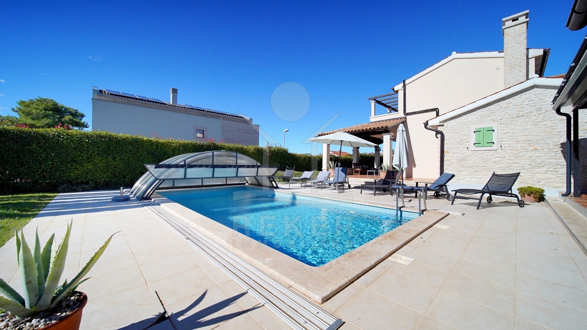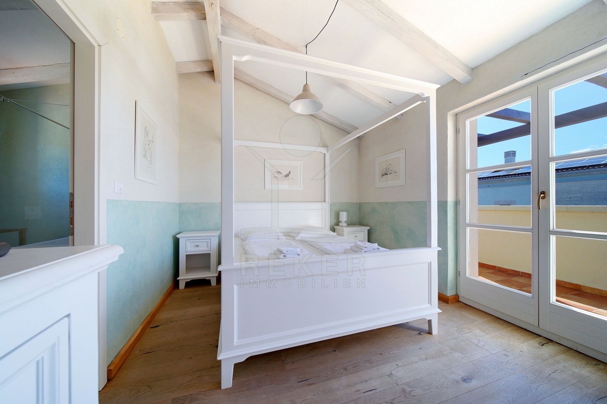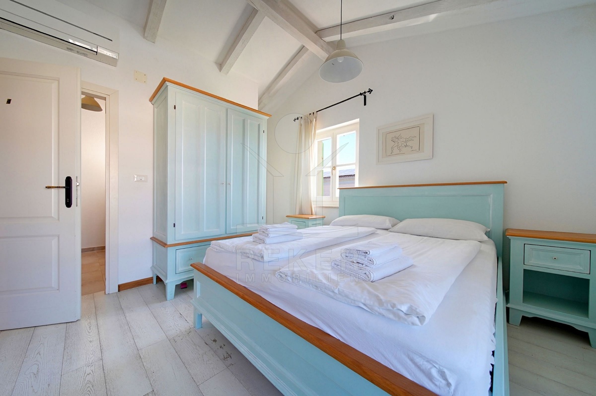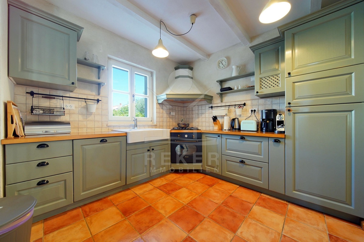 In einem ruhigen Wohnbereich von Fažana, nur rund 600 Meter vom Meer und Strand entfernt, steht diese 2014 erbaute Villa im traditionellen Stil. Sie wohnen angenehm nah an der Küste. Einkaufsmöglichkeiten, Restaurants und Einrichtungen des täglichen Bedarfs erreichen Sie schnell. Die Autobahnauffahrt Vodnjan ist etwa 6 Kilometer entfernt, der Flughafen Pula rund 14 Kilometer. Auf dem Grundstück innerhalb der Bauzone parken Sie drei Fahrzeuge auf eigenem Grund. Ein motorisiertes Einfahrtstor sorgt für zusätzlichen Komfort.