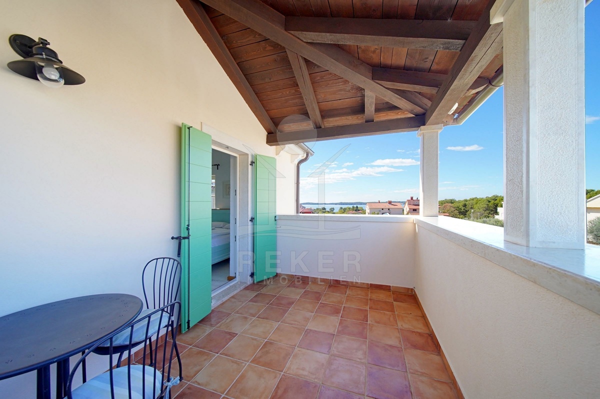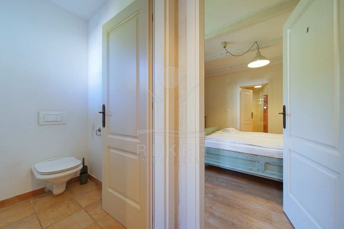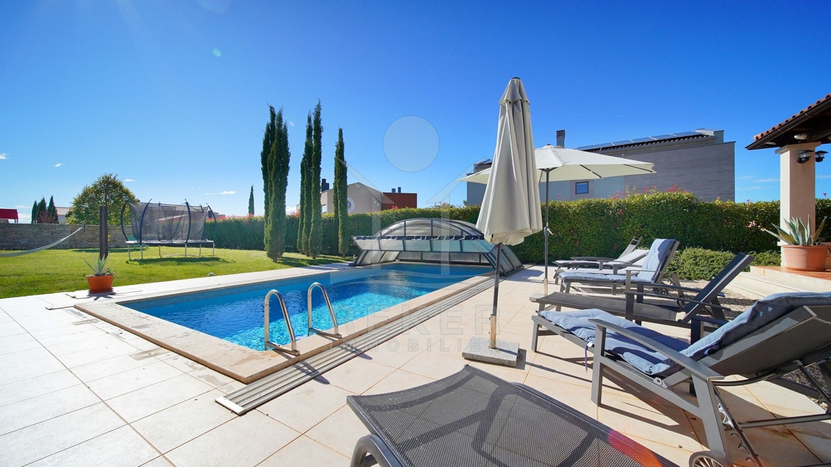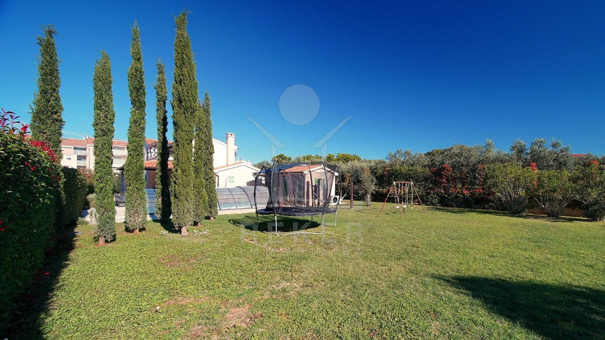 In einem ruhigen Wohnbereich von Fažana, nur rund 600 Meter vom Meer und Strand entfernt, steht diese 2014 erbaute Villa im traditionellen Stil. Sie wohnen angenehm nah an der Küste. Einkaufsmöglichkeiten, Restaurants und Einrichtungen des täglichen Bedarfs erreichen Sie schnell. Die Autobahnauffahrt Vodnjan ist etwa 6 Kilometer entfernt, der Flughafen Pula rund 14 Kilometer. Auf dem Grundstück innerhalb der Bauzone parken Sie drei Fahrzeuge auf eigenem Grund. Ein motorisiertes Einfahrtstor sorgt für zusätzlichen Komfort.