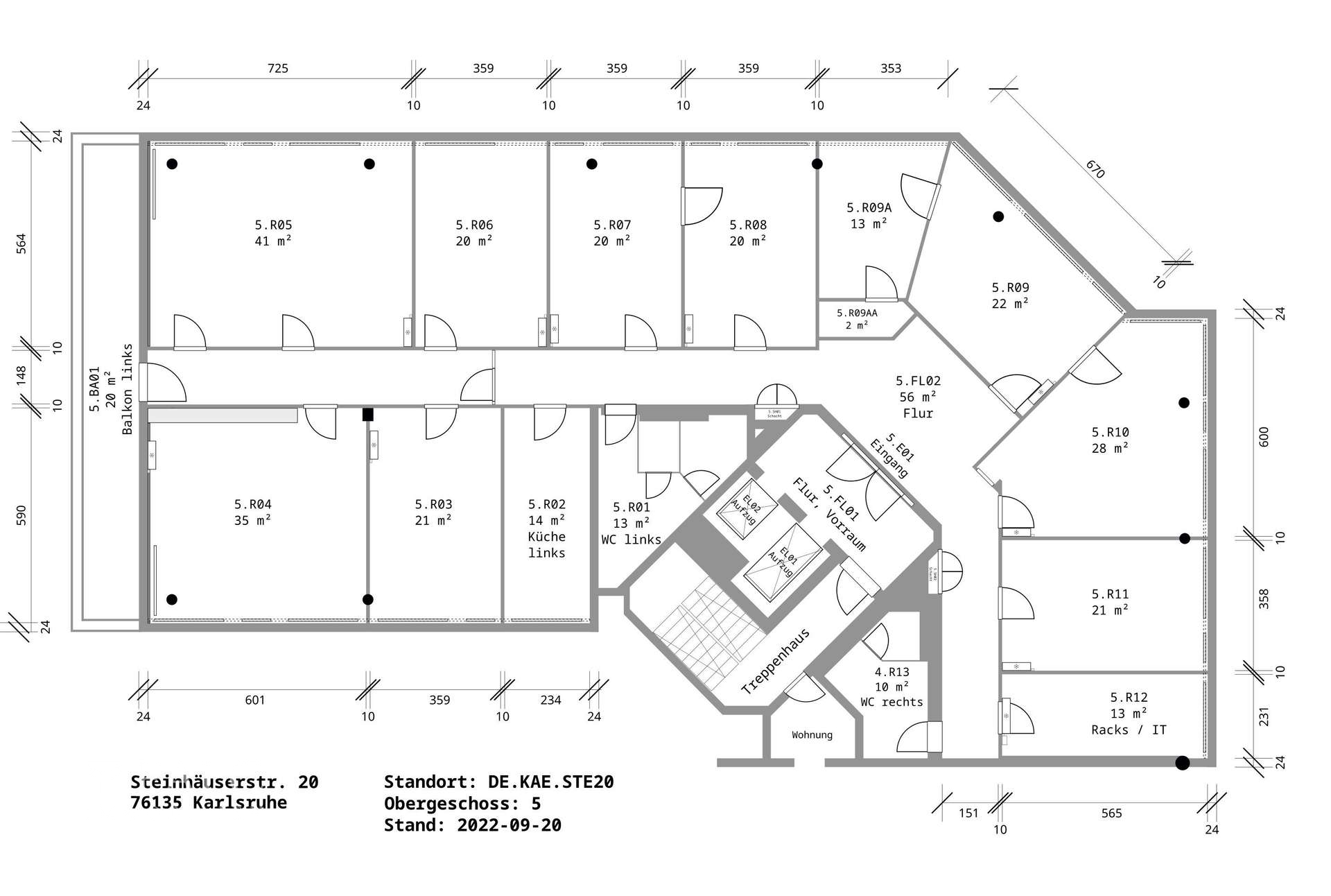 Technische Ausstattung: + Durchgängige elektronische Schließanlage, Zugänge zu einzelnen Räumen individuell programmierbar + Energieeffiziente Deckenbeleuchtung mit LED-Panels + 19-Zoll-Kabelrack, CAT6A-Sternverkabelung und separater Serverraum + Durchgängige CAT6A-Datenverkabelung (2–6 Datendosen pro Raum, Dosen in Zwischendecke; ideal auch für optimalesWLAN und PoE) + Glasfaseranschluss im Haus, Inhouse-Verkabelung bis ins Rack vorhanden (Glasfaserinternet direkt buchbar) + Weitere Internetoptionen: VDSL und Coax-Kabel (Vodafone) zusätzlich verfügbar, Coax-Anschluss bis ins Rack vorhanden
