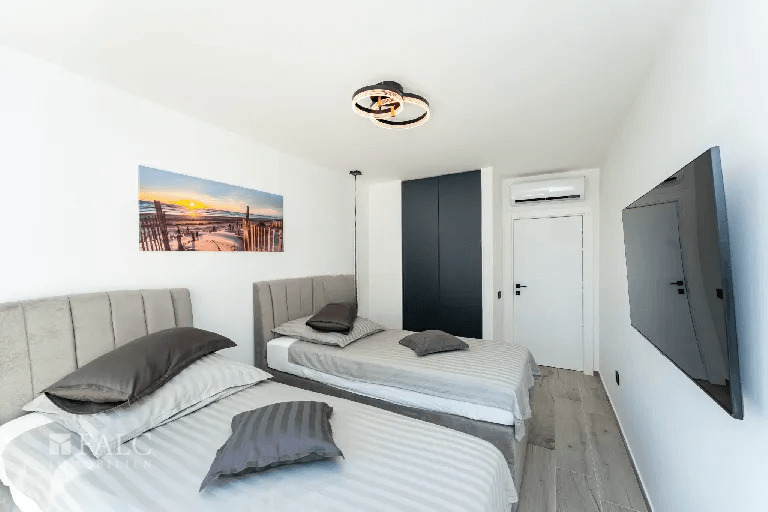 Die Villa überzeugt zudem durch ihre hochwertige Ausstattung: Eine wassergeführte Fußbodenheizung in allen Räumen, Klimaanlagen in jedem Zimmer, dreifach verglaste Fenster sowie elektrische Rollläden garantieren ein angenehmes Raumklima, Energieeffizienz und Privatsphäre. Das Dach ist bereits für die Installation von Solarpaneelen vorbereitet und unterstreicht den nachhaltigen Charakter der Immobilie.