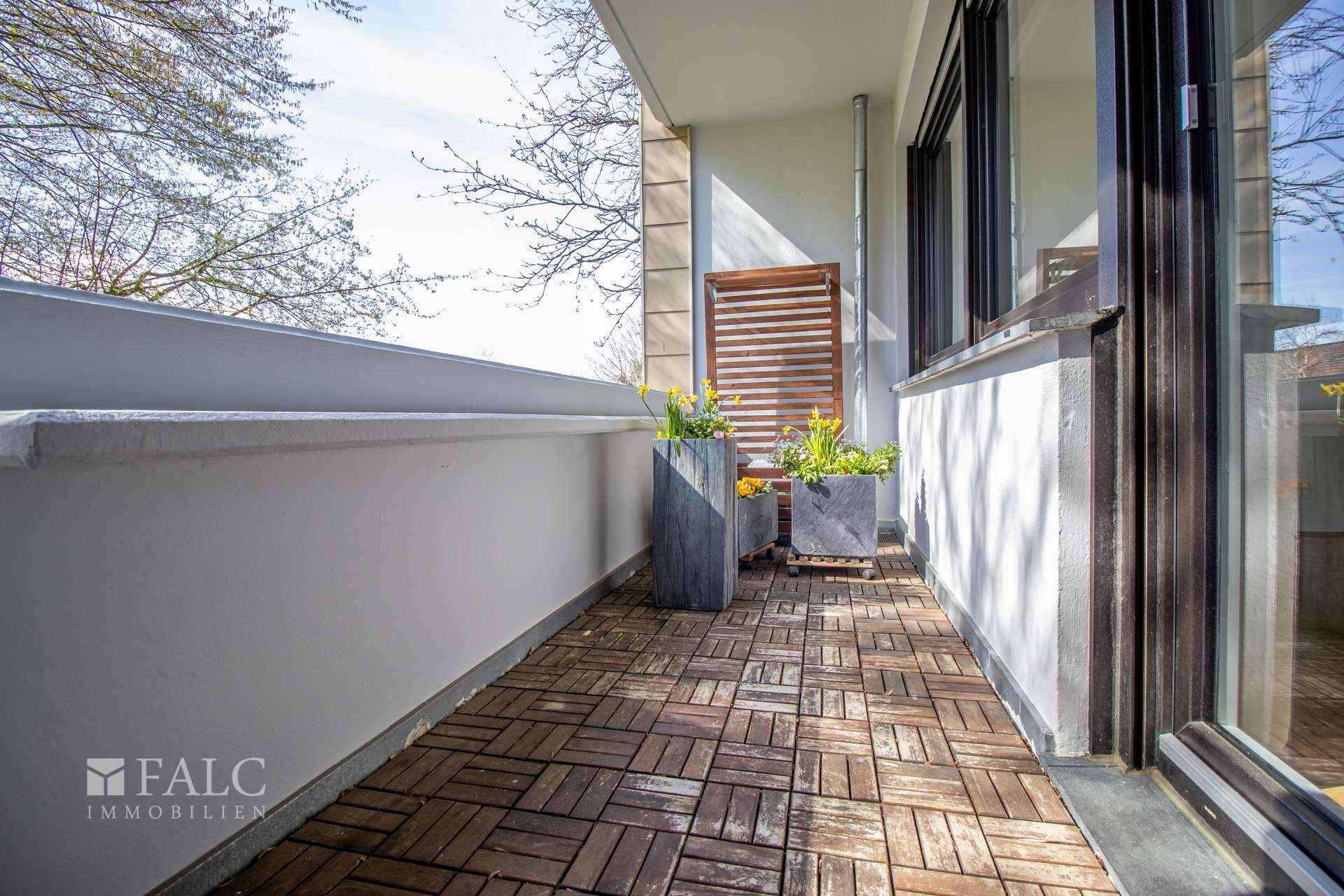 Ihr Wohnbereich mit beinahe 30 Quadratmetern Größe wird Sie begeistern! Direkt angrenzend betreten Sie den überdachten Balkon mit Aussicht auf die angrenzenden Grünflächen.