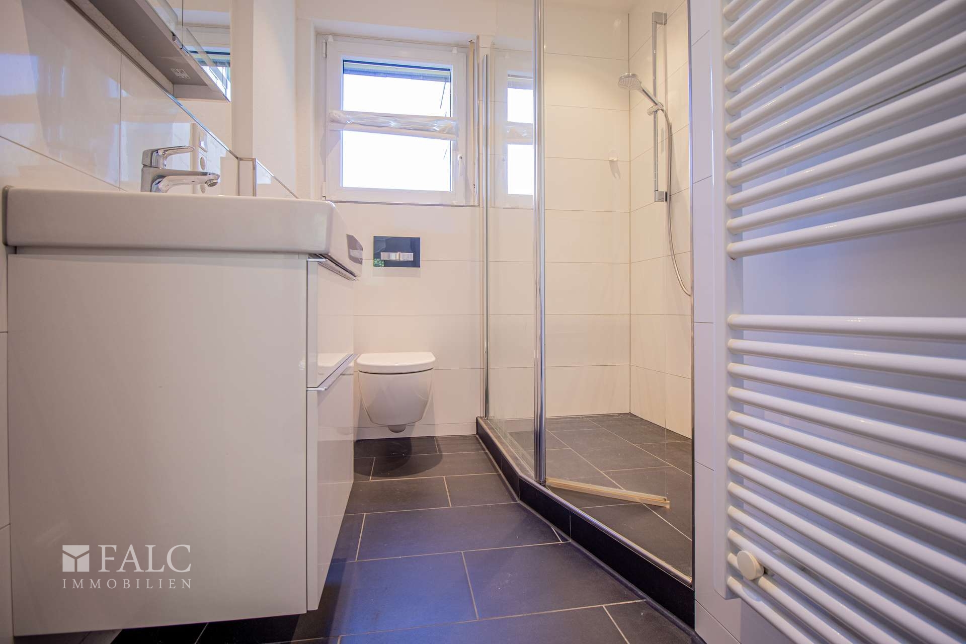 Ihr Badezimmer und Ihr Gäste-WC sind - zusätzlich zum Boden - halbhoch in weiß gefliest. Das Badezimmer weist ein Tageslichtfenster auf und ist mit einem Handtuchheizkörper sowie einer großen, begehbaren Dusche ausgestattet.