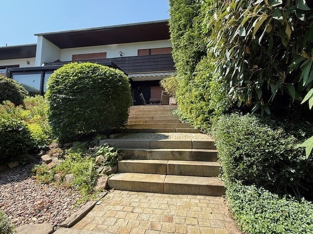 Über die Natursteintreppe erreichen Sie, die liebevoll angelegten Beete mit Natursteinumrandungen, die die Hanglage bestens in Szene setzen. Im unteren Bereich des Gartens vervollständigt ein weiterer Freisitz mit Gartenteich dieses Gartenidyll.