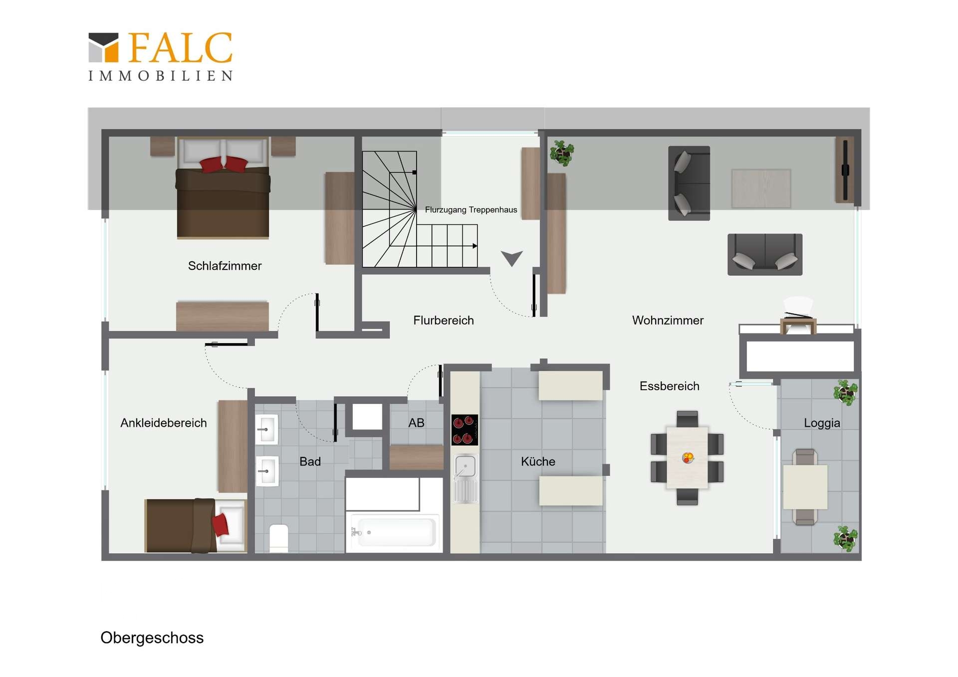 Das Obergeschoss hält weitere 3 Zimmer bereit. Statt eines Gäste-WCs wurde hier ein größeres Badezimmer eingebaut. Eine praktische Abstellkammer finden Sie hier ebenfalls. Über den Wohnbereich gelangen Sie auf die überdachte Loggia mit Blick in den Garten. Im Übrigen ist der Grundriss identisch zum Erdgeschoss