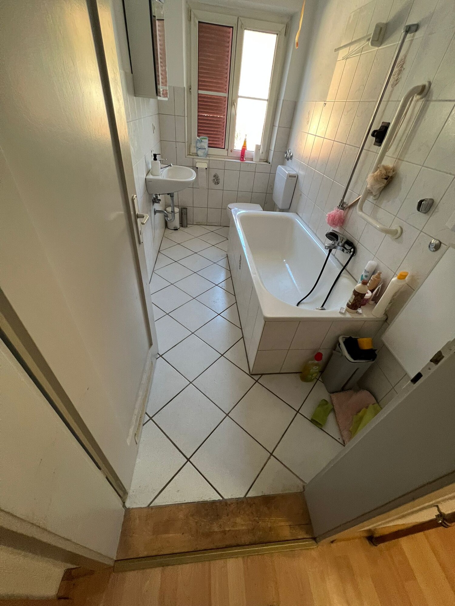 The apartment is shared as a flat with three people. The kitchen is for communal use and offers the basic necessities for daily life. The bathroom with a bathtub and natural light is also shared.
