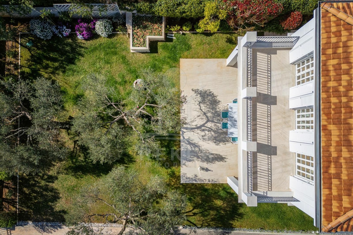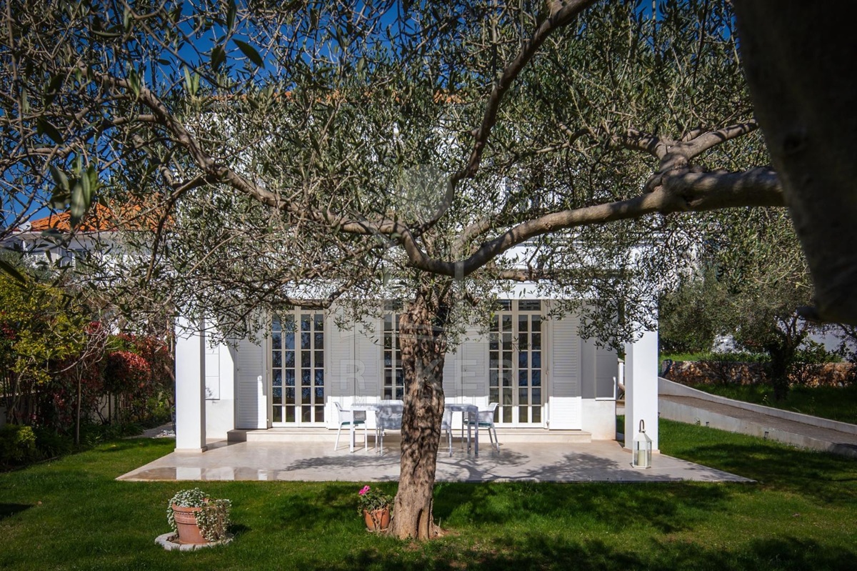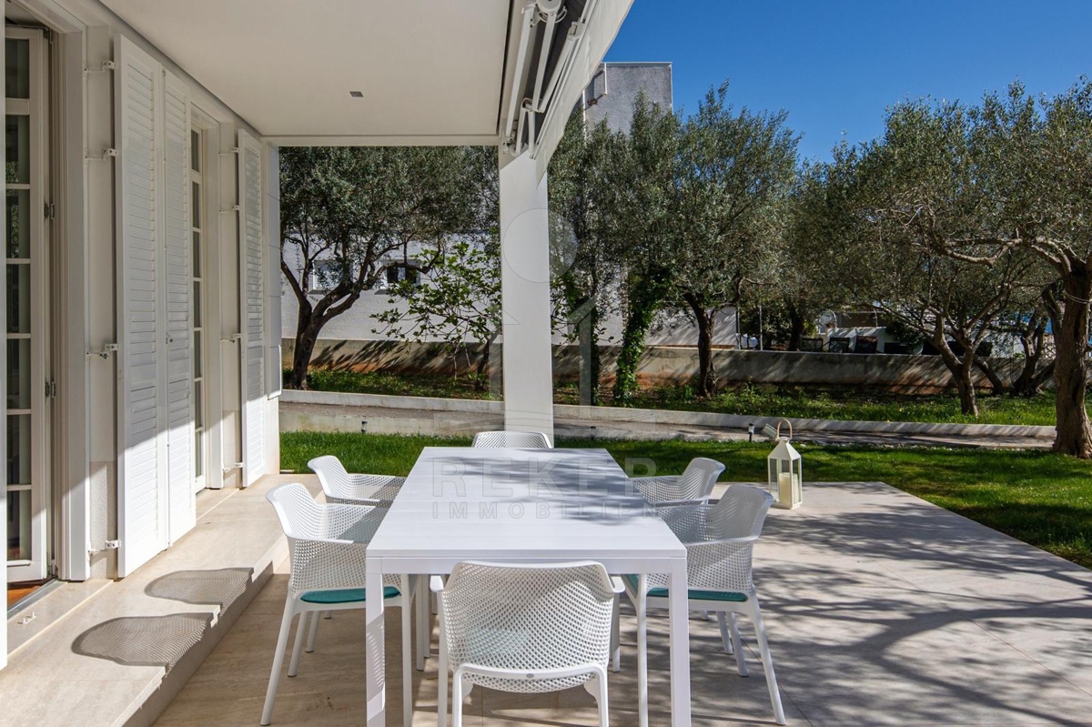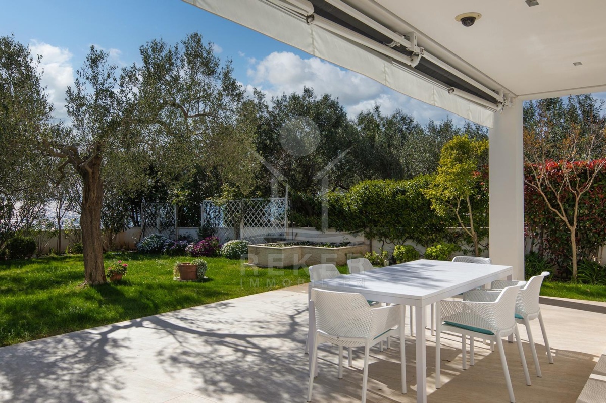 Das Grundstück von etwa 600 Quadratmetern ist sorgfältig gestaltet: ein gepflegter Rasen, alte Olivenbäume und eine überdachte Terrasse mit Markise schaffen eine Atmosphäre von Ruhe und Privatsphäre. Hier genießen Sie das Rauschen der Wellen und den freien Blick auf die Adria. Die Hauptterrasse lädt zum Essen im Freien ein, während die große obere Terrasse ideale Bedingungen für Sonnenbäder oder entspannte Abende mit Meerblick bietet.