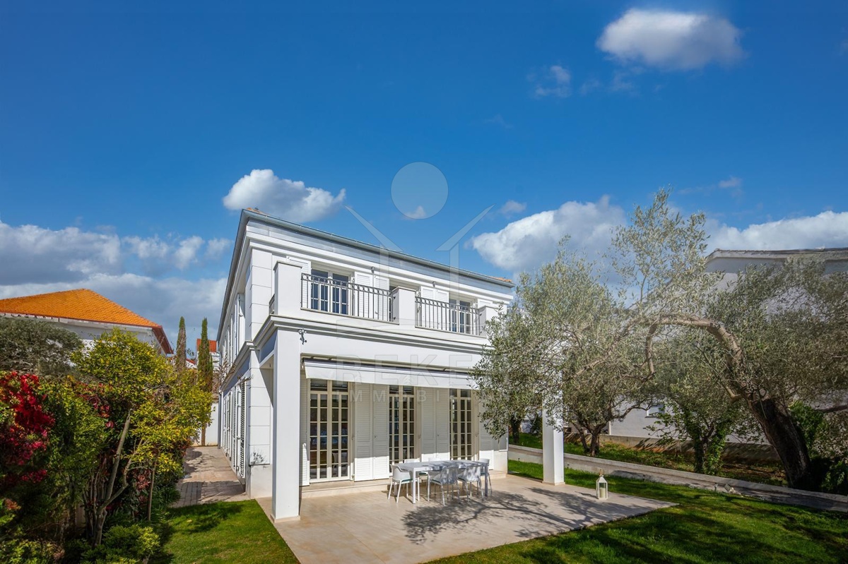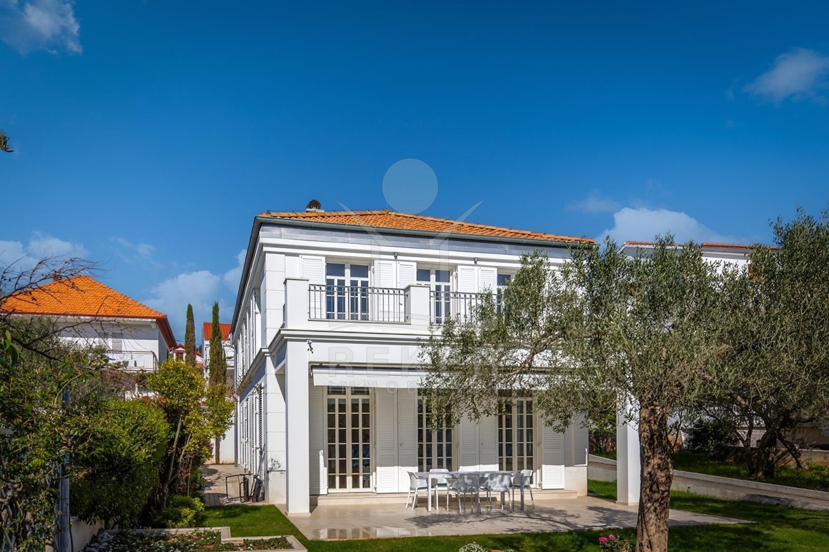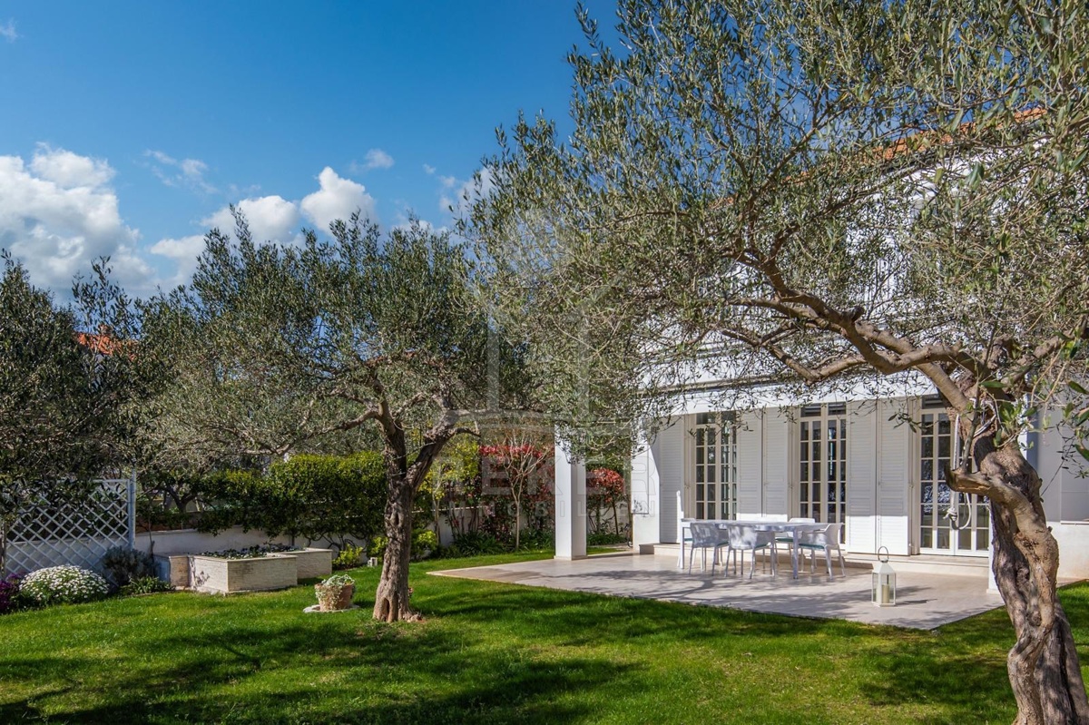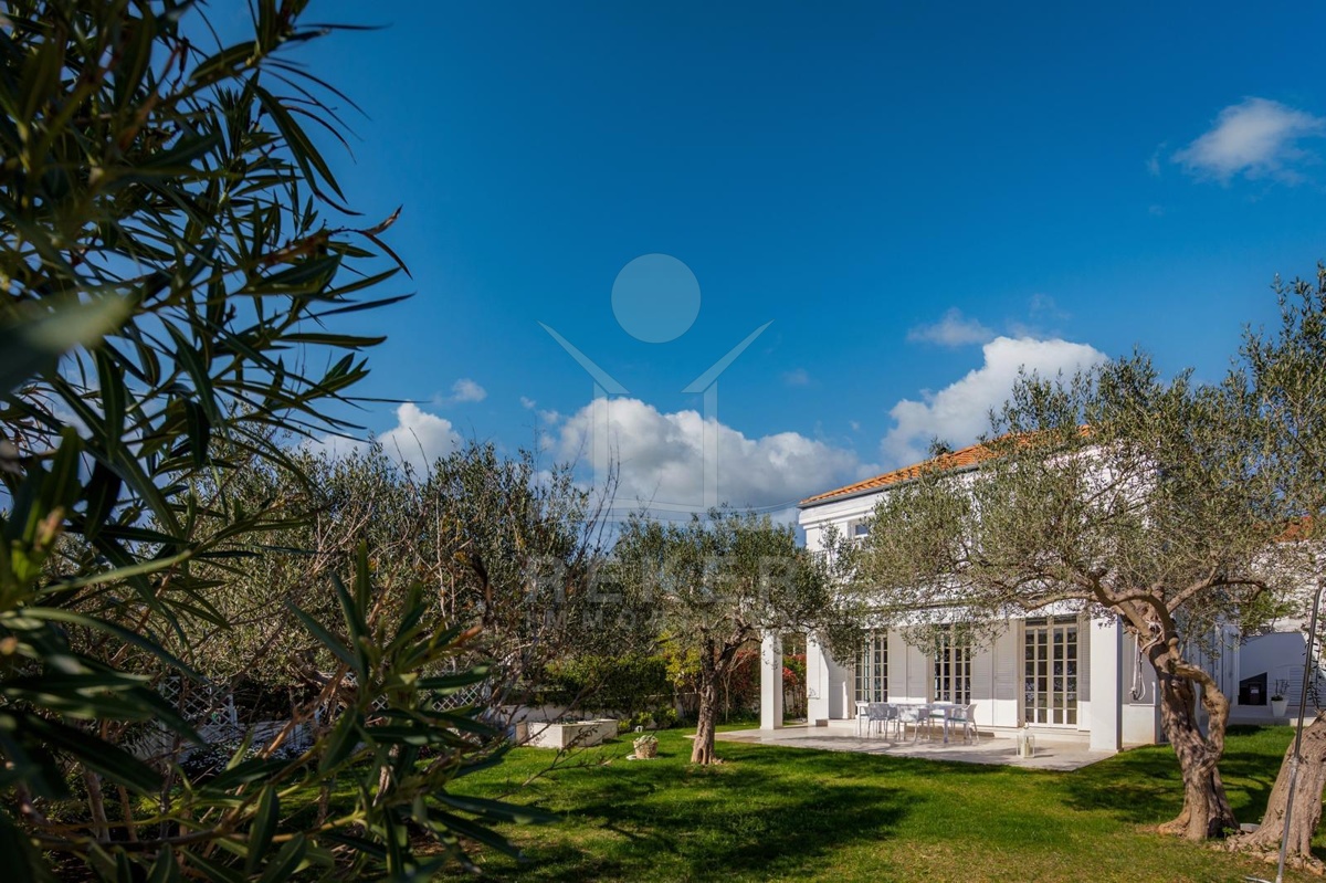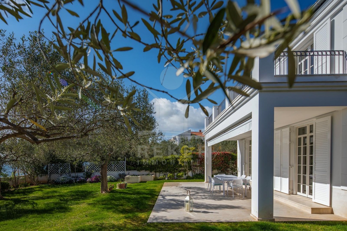Das Grundstück von etwa 600 Quadratmetern ist sorgfältig gestaltet: ein gepflegter Rasen, alte Olivenbäume und eine überdachte Terrasse mit Markise schaffen eine Atmosphäre von Ruhe und Privatsphäre. Hier genießen Sie das Rauschen der Wellen und den freien Blick auf die Adria. Die Hauptterrasse lädt zum Essen im Freien ein, während die große obere Terrasse ideale Bedingungen für Sonnenbäder oder entspannte Abende mit Meerblick bietet.
