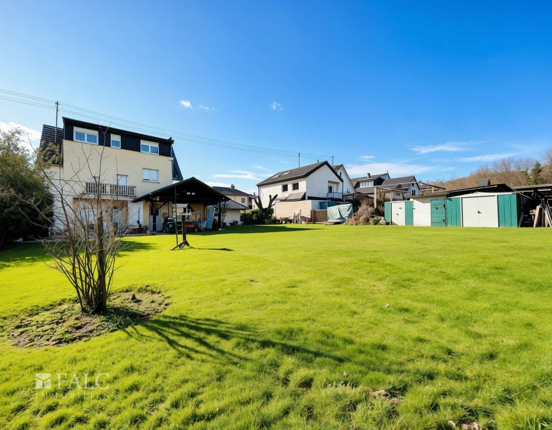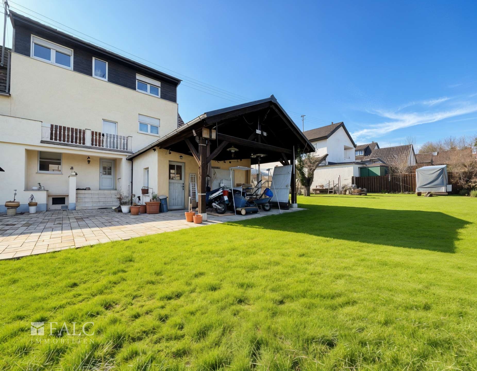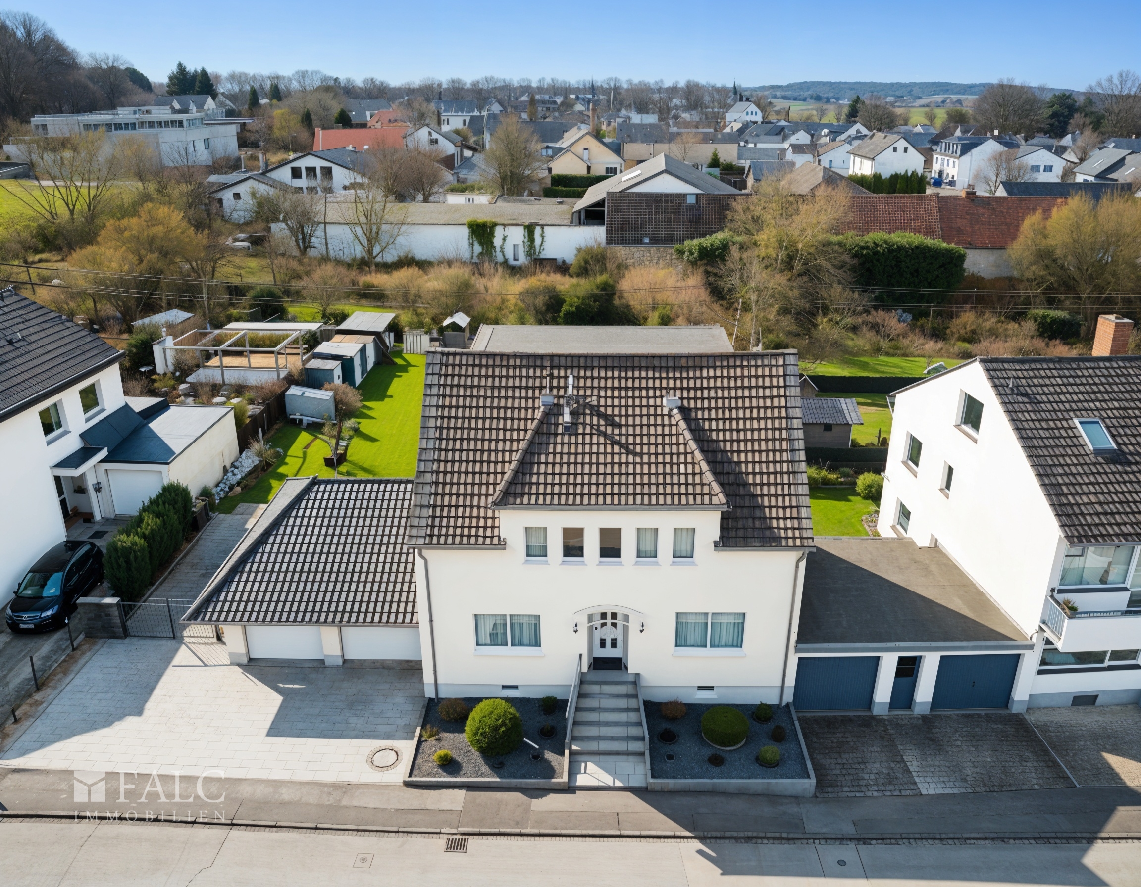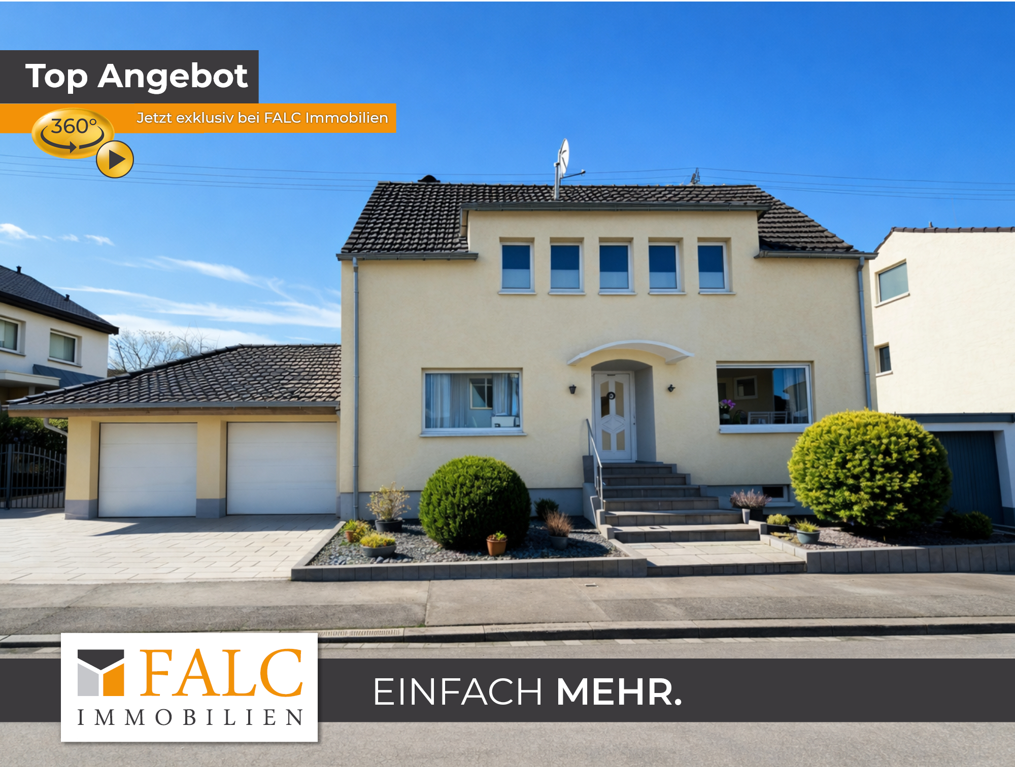 Auch im Außenbereich überzeugt die Immobilie durch ein außergewöhnlich großzügiges Platzangebot. Die große Doppelgarage bietet ausreichend Raum für Fahrzeuge, Fahrräder und zusätzliche Abstellflächen. Neben der Garage befindet sich eine großzügige Einfahrt, die weiteren Platz für mehrere Fahrzeuge bietet und somit ideale Parkmöglichkeiten für Bewohner und Gäste schafft.