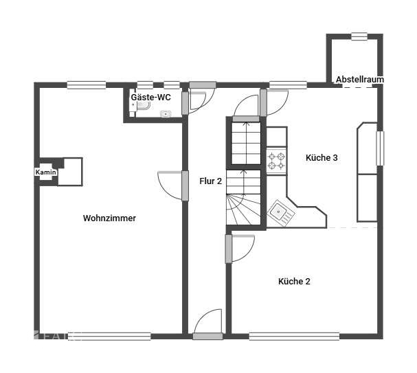 Der Eingangsbereich ist hell und freundlich gestaltet und bietet eine durchdachte Raumaufteilung. Von hier aus gelangt man auf der linken Seite in das geräumige Wohnzimmer, das mit einem Ofen ausgestattet ist und eine besonders gemütliche Wohnatmosphäre schafft. Im Flur befindet sich ein Gäste-WC. Rechts vom Eingangsbereich führt der Zugang in die Küche mit integriertem Essbereich sowie in einen separaten Vorratsraum, der zusätzlichen Stauraum bietet. Geradeaus durch den Flur öffnet sich der direkte Zugang zum Garten. Ebenfalls vom Flur aus erreicht man sowohl die Treppe in das erste Obergeschoss als auch den Zugang in den Keller.