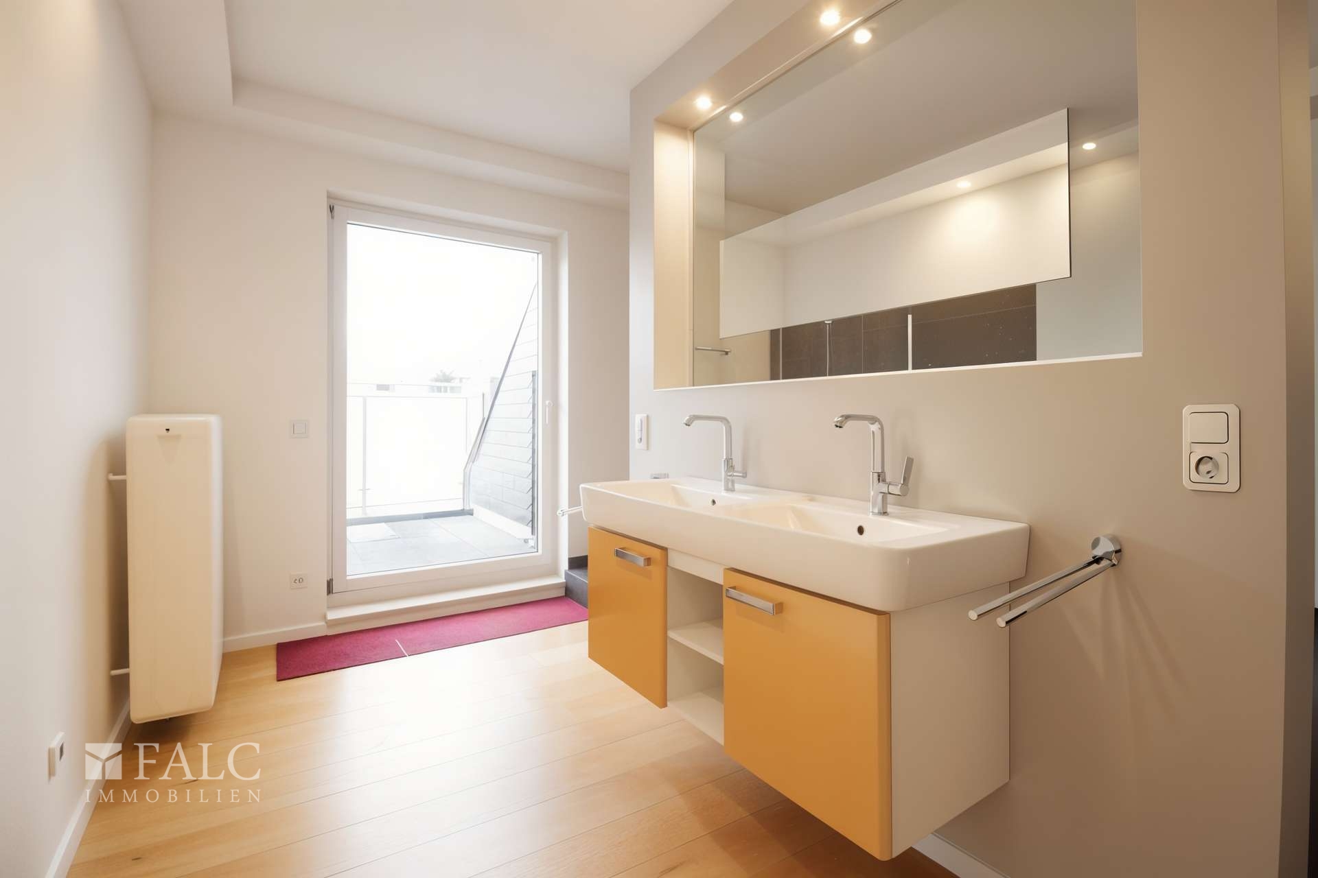 Für die Bodenbeläge wurde helles Echtholz-Parkett gewählt. Die Badezimmer sind mit dunklen, pflegeleichten Fliesen ausgestattet. Eine breite begehbare Dusche, eine Wanne und zwei Waschtische bilden Ihren Wellness-Bereich.