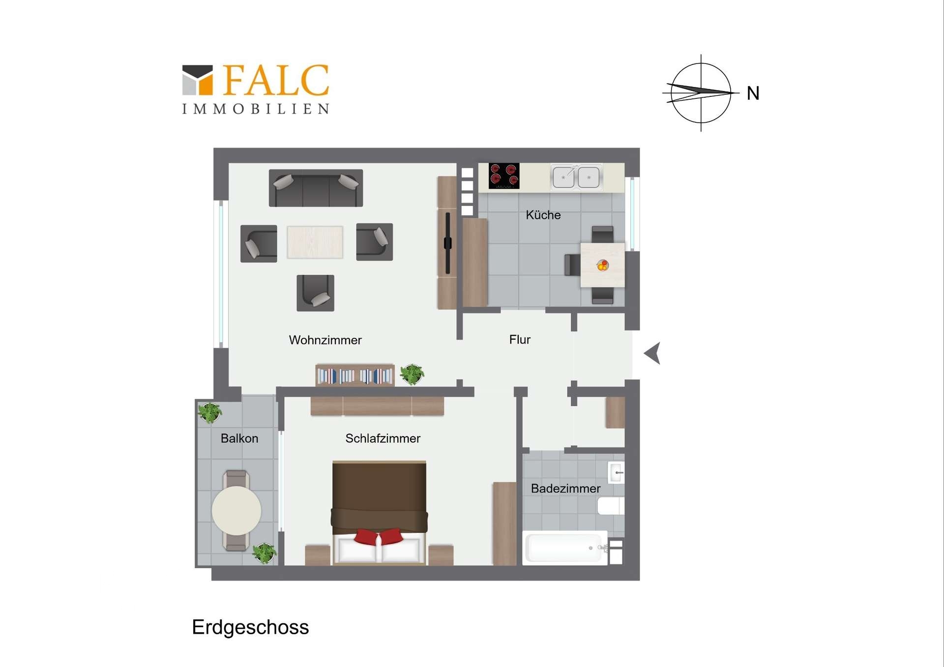 Die Raumaufteilung ist funktional gestaltet: von der zentralen Diele aus sind alle Räume begehbar. Das lichtdurchflutete Wohnzimmer bietet ausreichend Raum für gemütliche Stunden und direkten Zugang zum Südbalkon, der Ihnen sonnige Nachmittage mit Blick ins Grüne garantiert. Das Schlafzimmer punktet mit angenehmer Ruhe, perfekt zum Abschalten und Erholen. Die kompakte Küche bietet ausreichend Platz für eine Küchenzeile und zusätzliche Stellfläche. Hier lassen sich mit wenigen Handgriffen kulinarische Highlights zaubern. Das innenliegende Bad ist funktional gestaltet und verfügt über eine Badewanne. Ein zusätzlicher Abstellraum in der Wohnung sorgt für praktische Staufläche.
