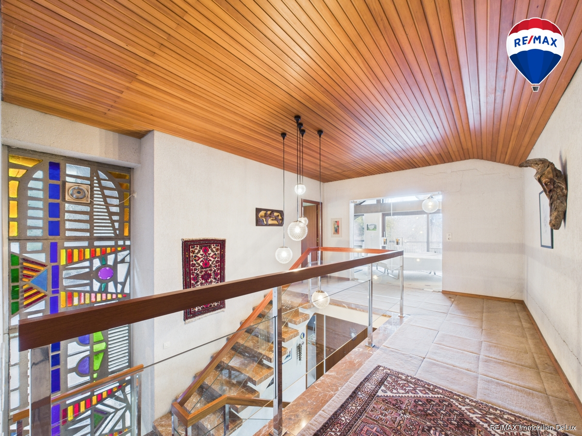 Hinter dem Vorderhaus befindet sich das großzügige Haupthaus, das bereits im Baujahr 1969 mit einer damals außergewöhnlich modernen Architektur realisiert wurde. Beim Betreten empfängt Sie ein beeindruckender Eingangsbereich, geprägt von einer offenen Marmortreppe, die alle drei Etagen miteinander verbindet.