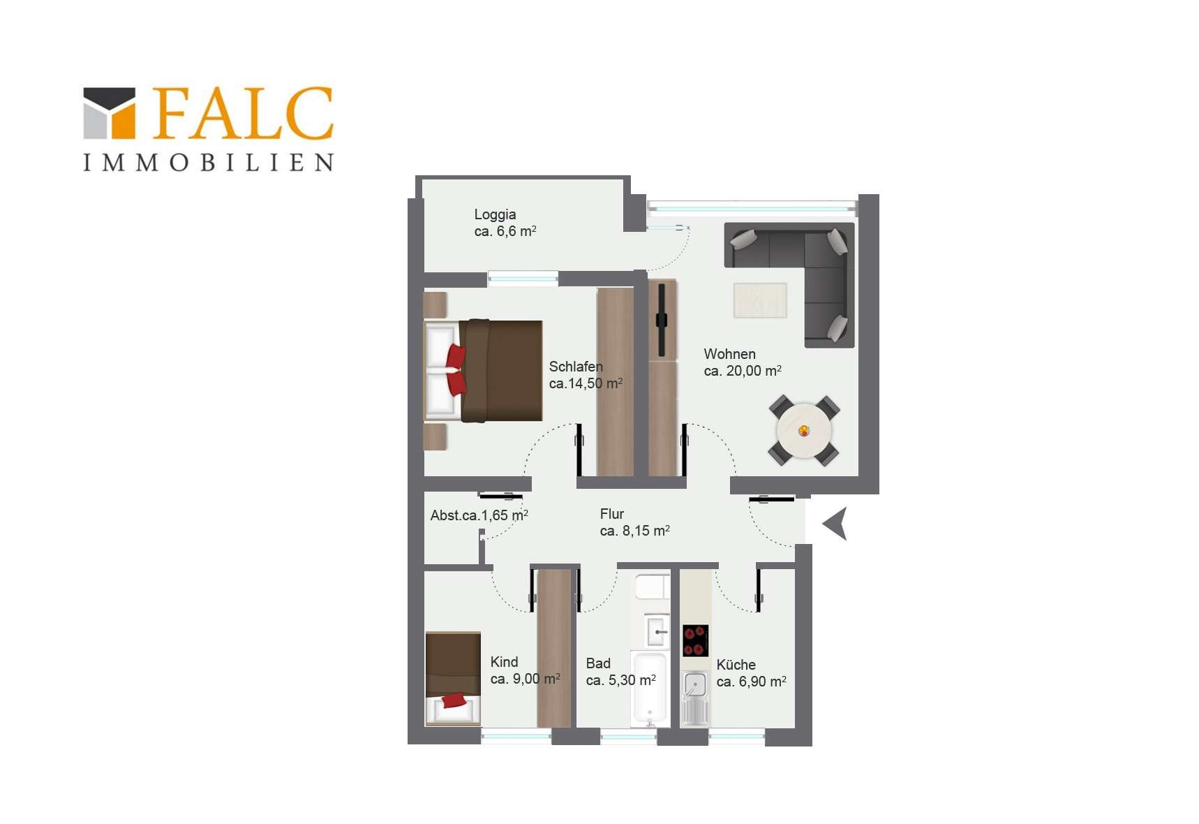 Besonders angenehm ist die Loggia, die dem Wohnen eine zusätzliche, geschützte Außenfläche schenkt, für frische Luft, Pflanzen oder einen kurzen Moment Pause.