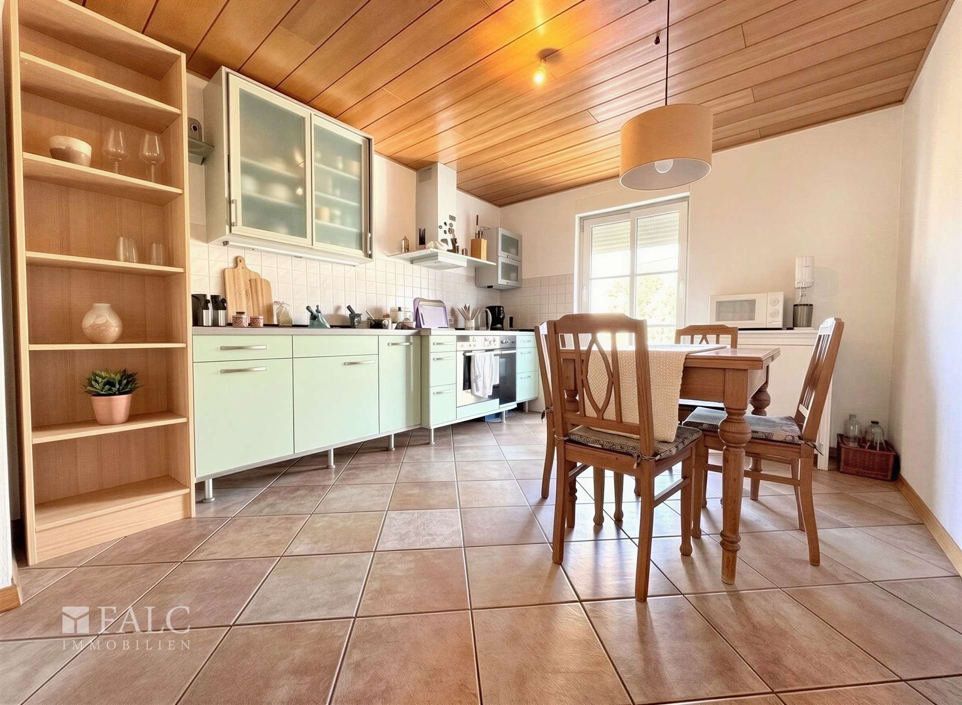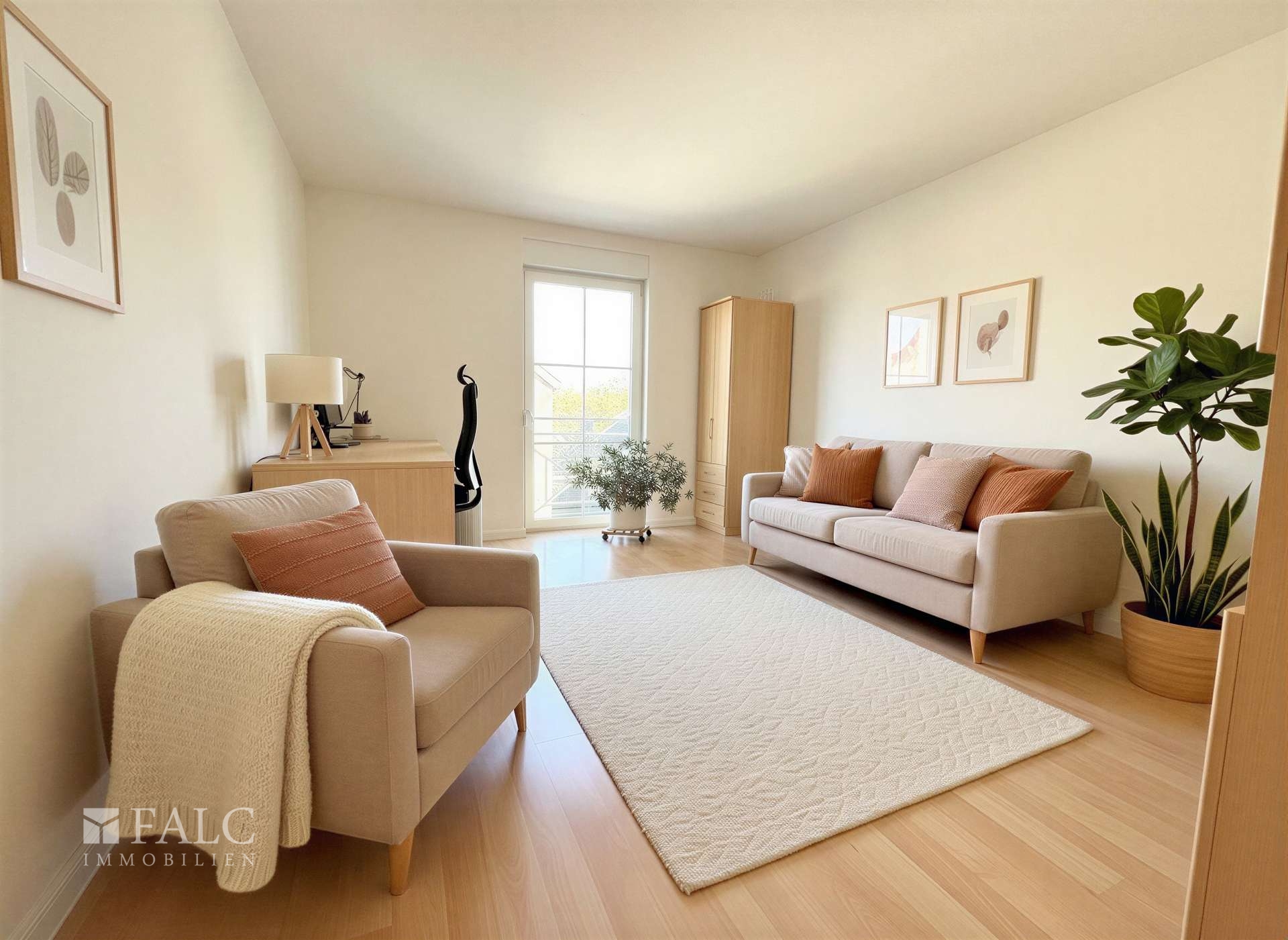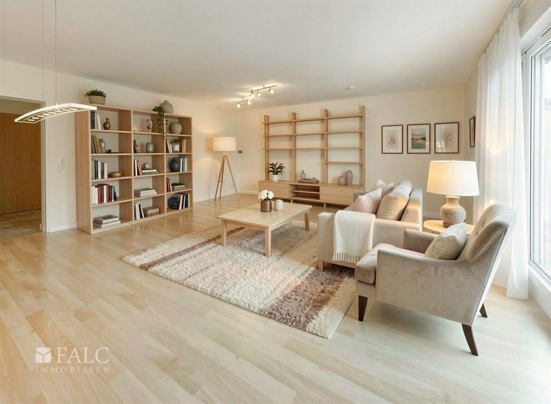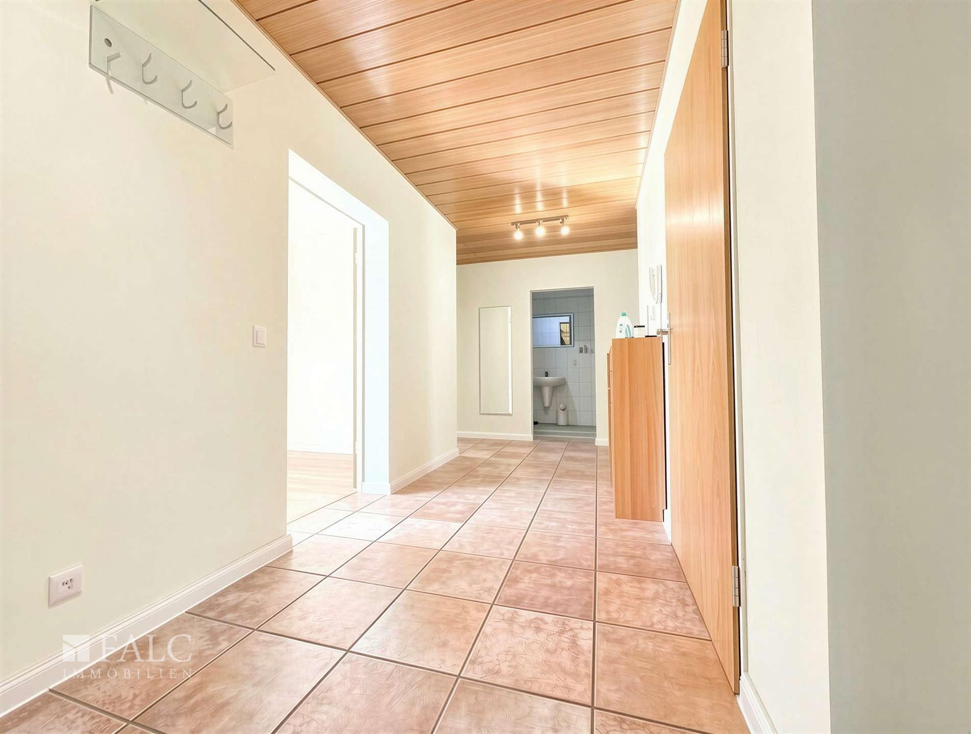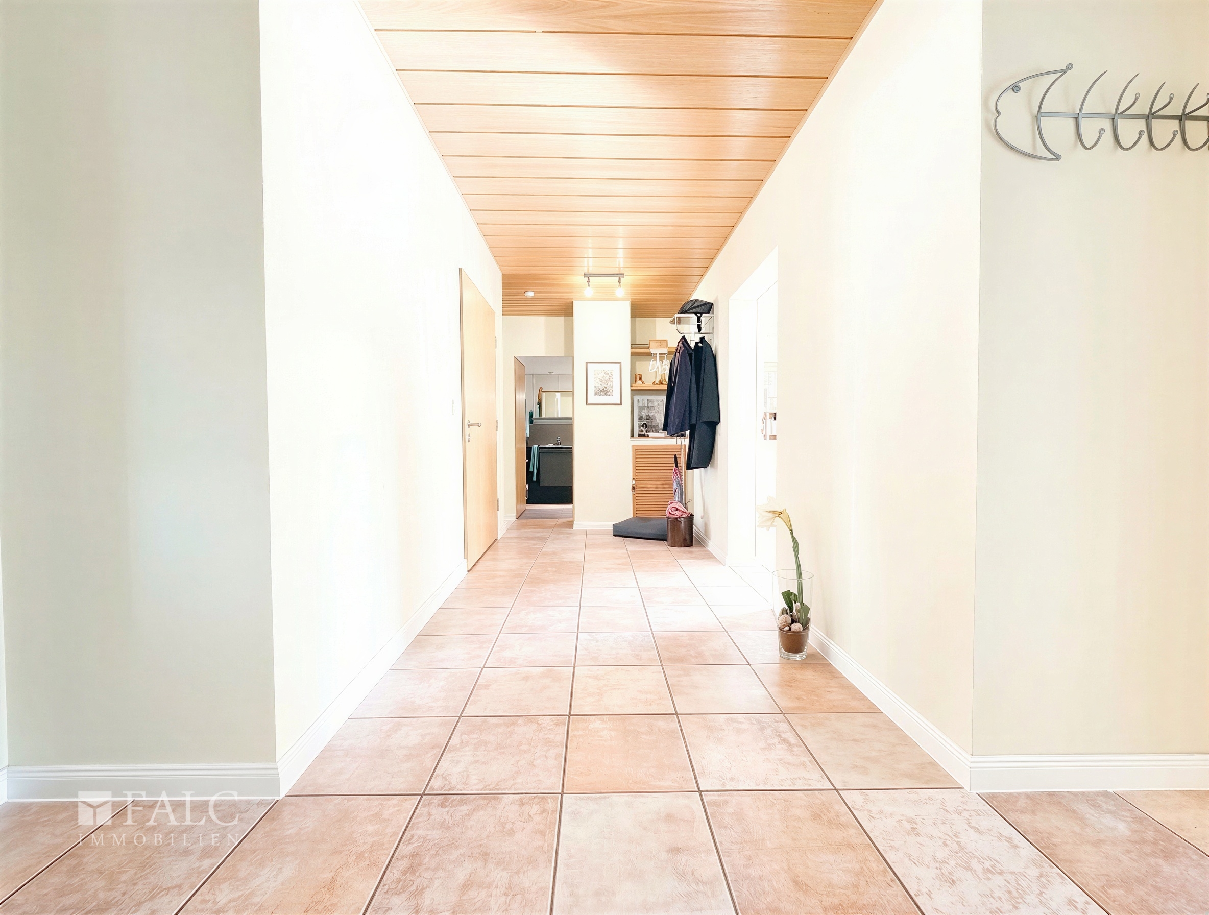Der Flur und die Küche sind mit pflegeleichten Fliesen ausgestattet, die für eine stilvolle Optik sorgen. In den Wohnräumen, wie dem Wohnzimmer, Büro und Schlafzimmer, wurde hochwertiger Laminatboden verlegt, der für eine angenehme und gemütliche Atmosphäre sorgt.