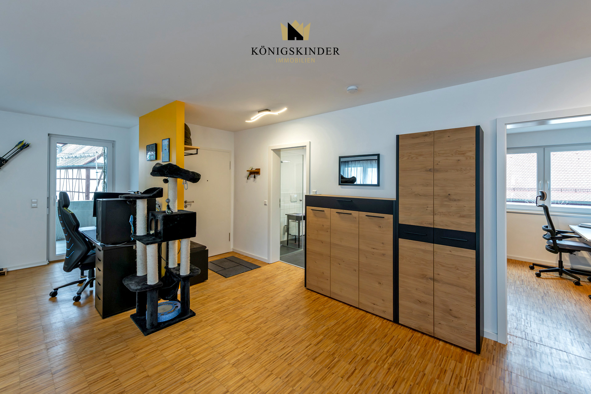 Im Inneren erwarten die Bewohner helle, gut geschnittene Wohnungen mit hochwertigem Echtholzparkett in Wohn‑ und Schlafbereichen sowie modernen Fliesen in Bädern und Küchen. Sämtliche Innentüren und Türzargen sind in Weiß ausgeführt und unterstreichen gemeinsam mit den großen Kunststoff‑Isolierglasfenstern und den weißen Wandflächen den modernen, freundlichen Charakter des Hauses. Eine effiziente Luft/Wasser‑Wärmepumpe, Fußbodenheizung in allen Wohnungen sowie zusätzliche Handtuchheizkörper in den Bädern sorgen für behagliche Wärme und zeitgemäßen Wohnkomfort.