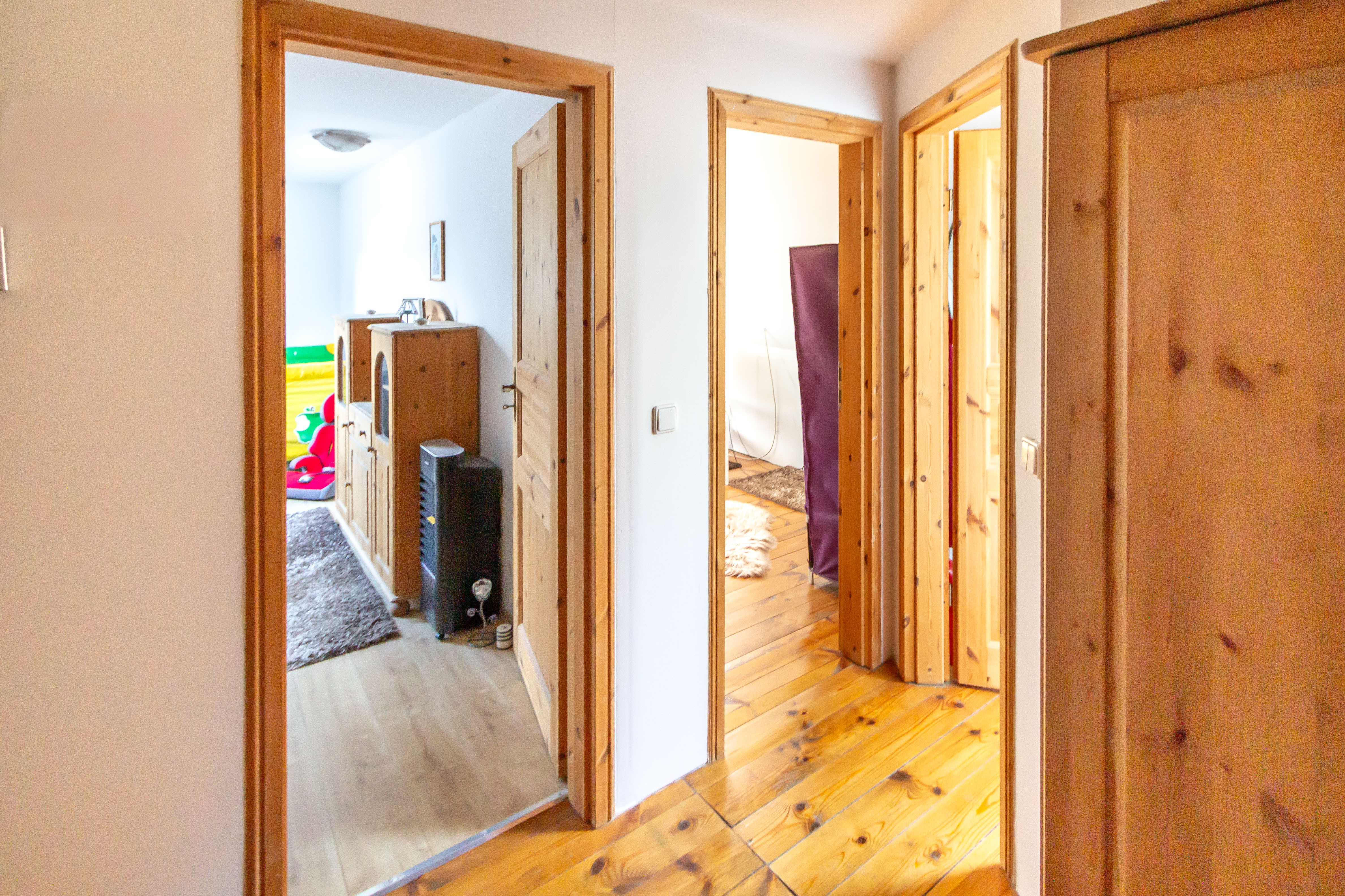 Erdgeschoss: • geflieste Eingangsdiele mit Treppe zum Dachgeschoss • geräumiges Wohnzimmer • gefliestem Wannenbad mit WC und Waschbecken • großes Schlafzimmer • Küche mit Kachelofen und Zugang zur überdachten Terrasse • Eingang vom Hof über eine Veranda