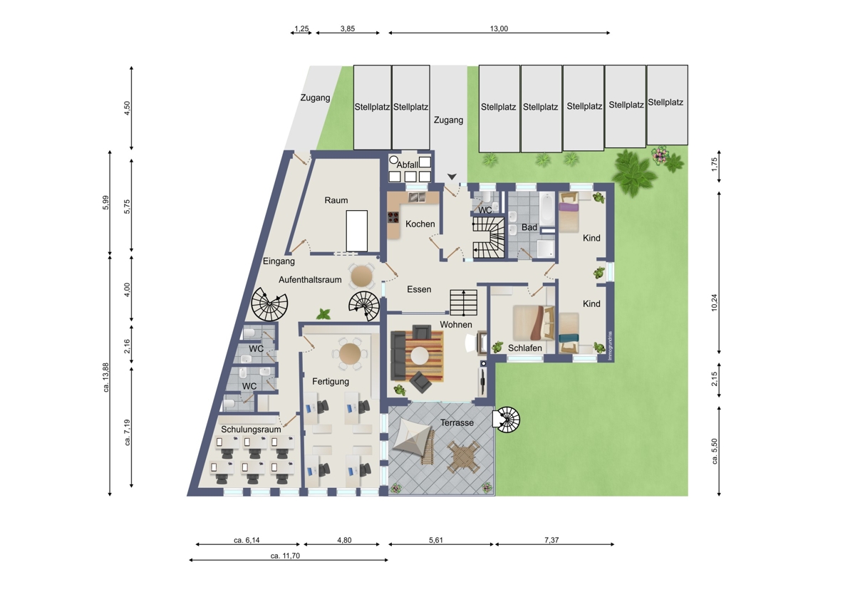 * Wohnung UG:3 Zimmer-Wohnung mit Terrasse ca. 80,78qm (Frei und sofort beziehbar) * Wohnung EG:4 Zimmer-Wohnung mit XL-Terrasse ca.112,91qm (lebenslanges Wohnrecht eingetragen ) * Wohnung/Büro OG:4-Zimmer-Büro mit XXL-Dachterrasse * UG Fertigung: 134,06qm * EG Aufenthalts- Schulungs-und Anlieferungsräume: ca. 144,75qm * 7 KFZ-Stellplätze im Freien