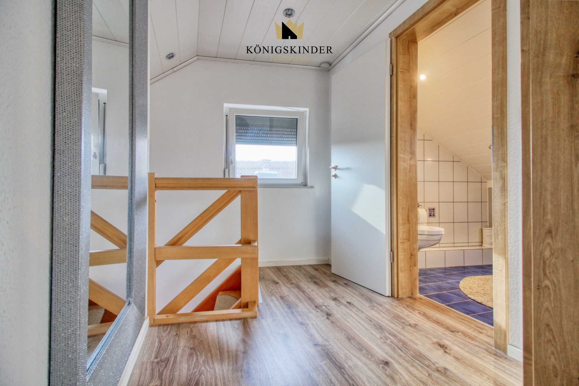 Im Dachgeschoss befindet sich ein weiteres Badezimmer mit Waschbecken und WC.