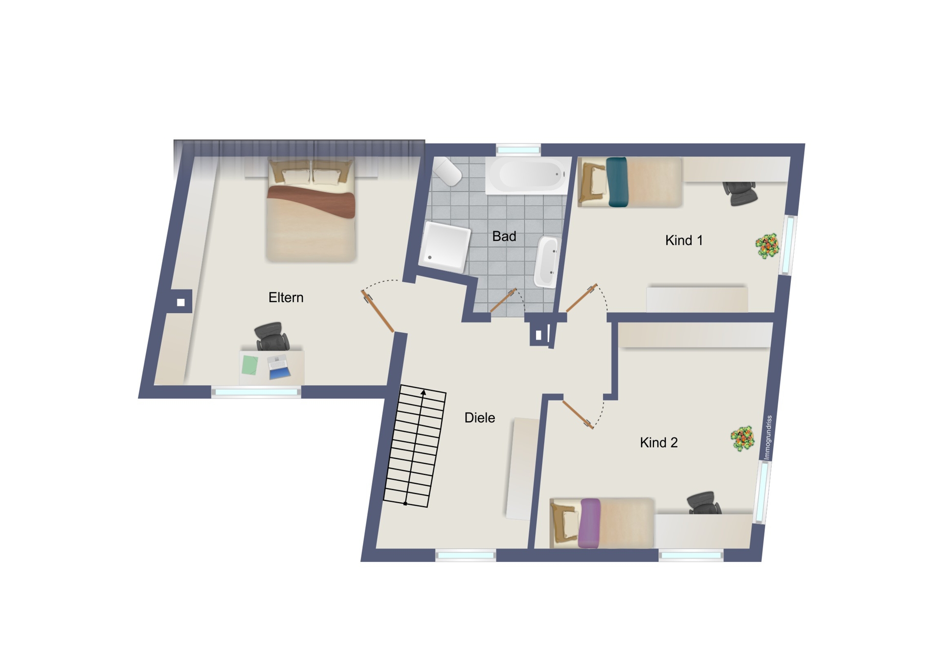 Das erste Obergeschoss bietet ein Schlafzimmer sowie zwei Kinderzimmer.