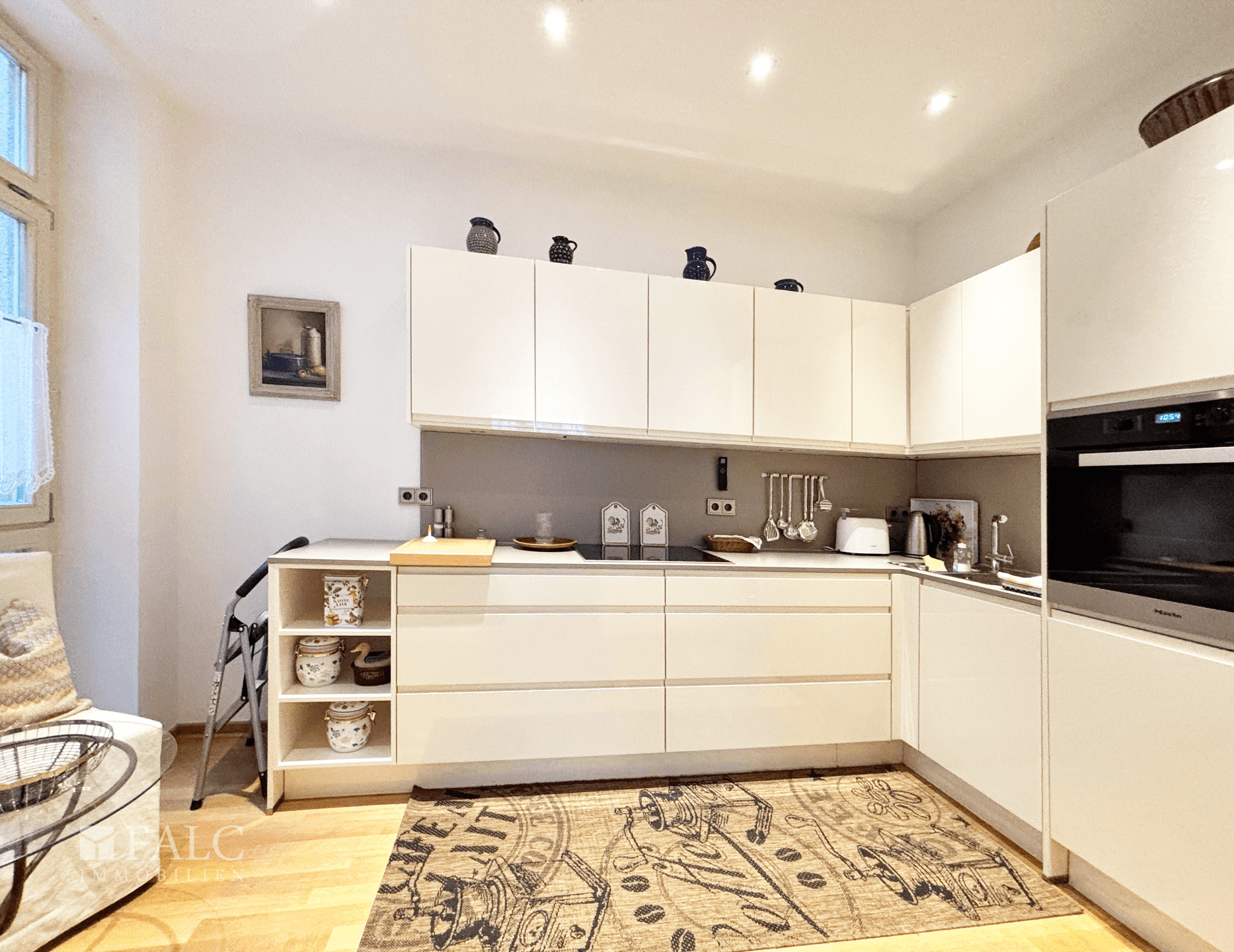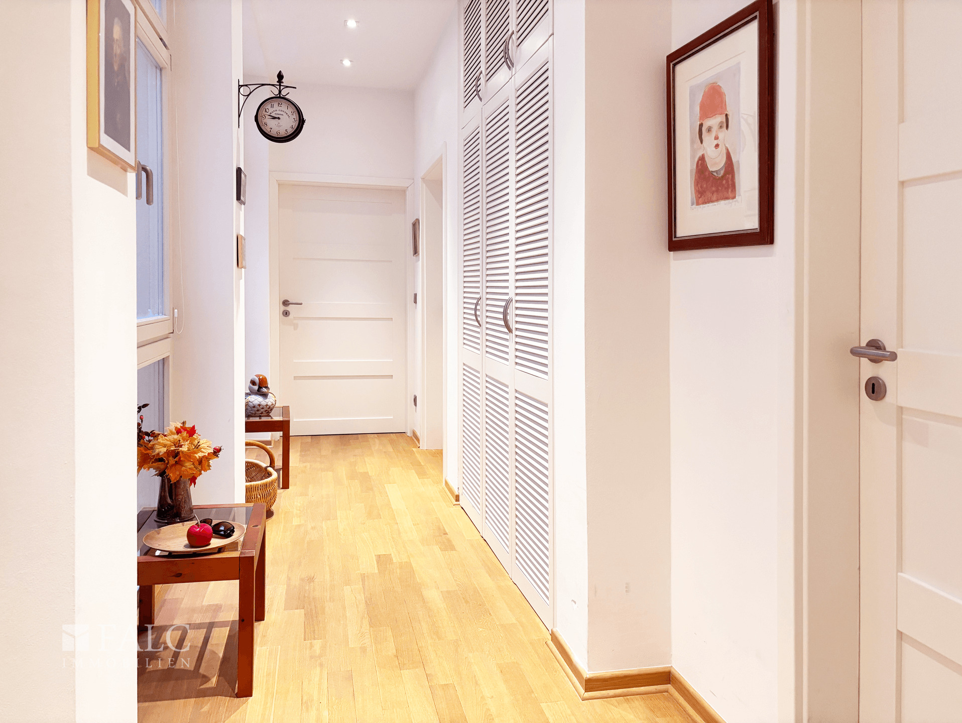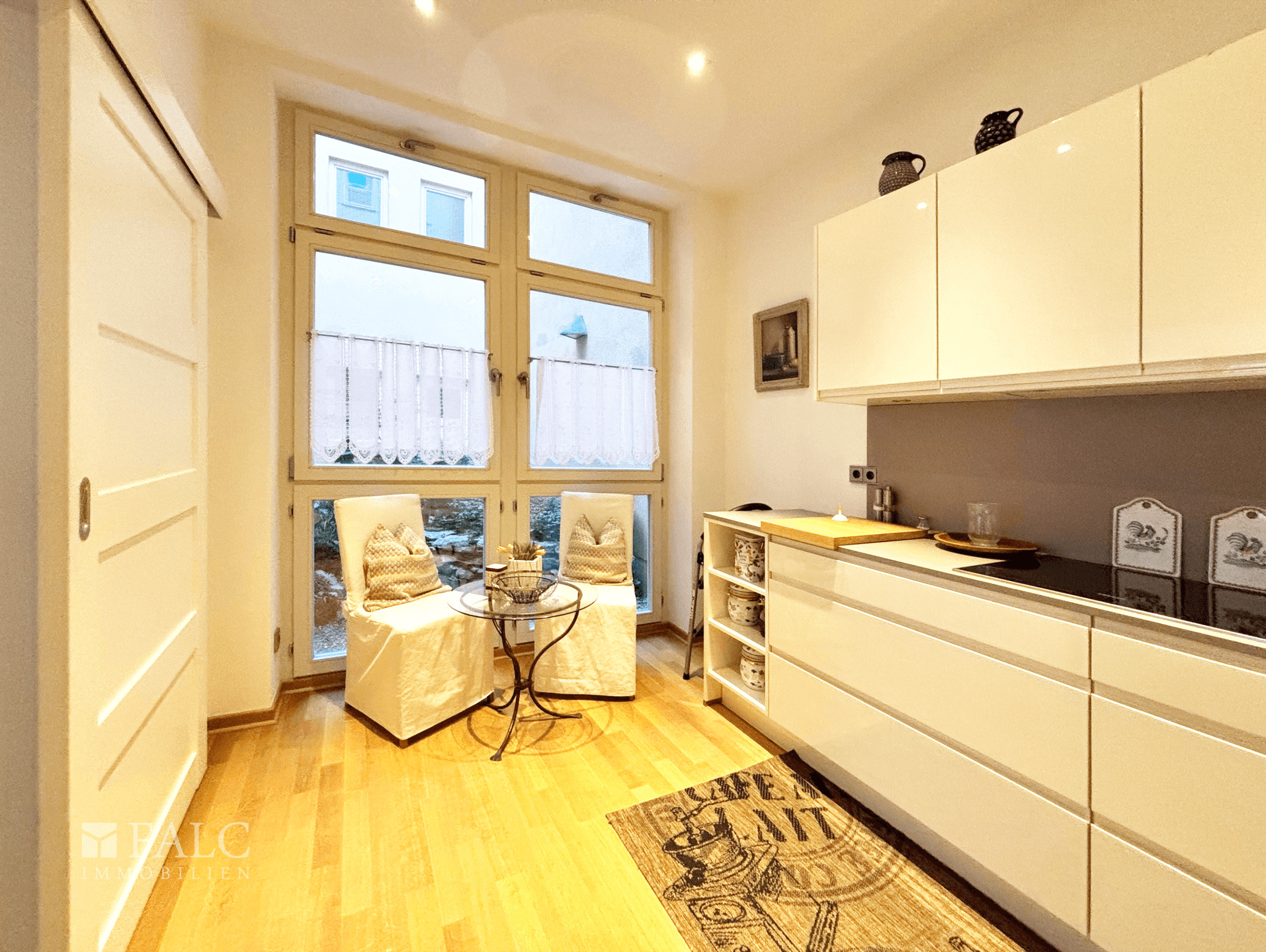 Bereits beim Betreten des Innenhofs spürt man die Großzügigkeit historischer Proportionen: aufwändig restaurierte Wände, angenehme Raumtiefen, eine ruhige Selbstverständlichkeit. Gleichzeitig öffnet sich der Wohnraum zur geschützten Terrasse im Innenhof – ein Ort, der Ruhe ausstrahlt und den Alltag entschleunigt.