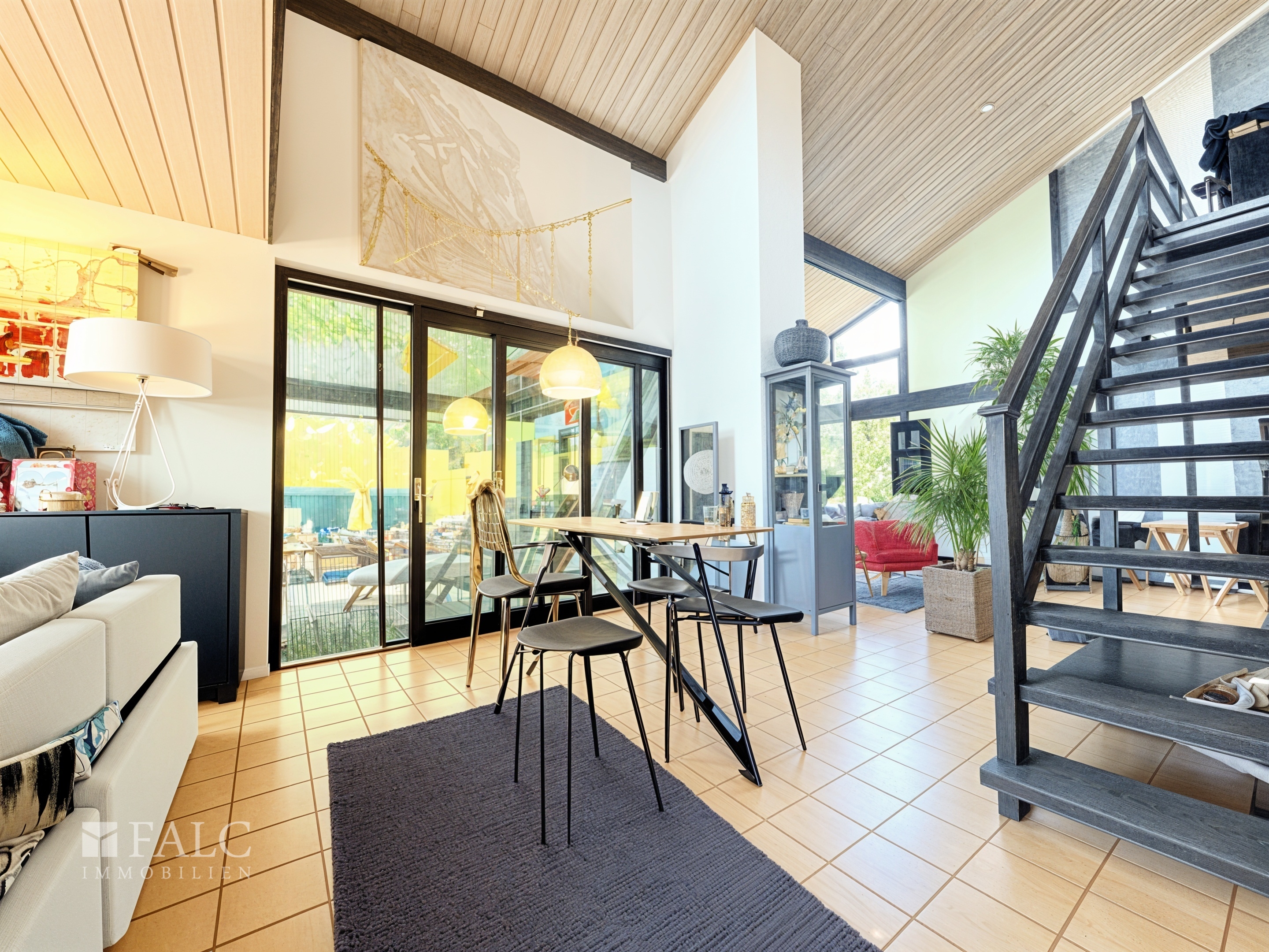 Die Galerie im Dachgeschoss bietet ausreichend Platz für ein weiteres Schlafzimmer oder einen Arbeitsbereich. Vom Ess- und Wohnbereich im Obergeschoss aus besteht direkter Zugang zum Garten.