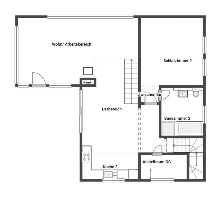 Die Einliegerwohnung empfängt Sie mit einem großzügigen Flur, von dem aus Sie zur linken Seite in ein Büro sowie in die offene Küche gelangen. Rechts befindet sich das Badezimmer, und geradeaus schließt sich das Schlafzimmer an. Ein direkter Zugang von der Küche führt in die angrenzenden Heiz- und Lagerräume.