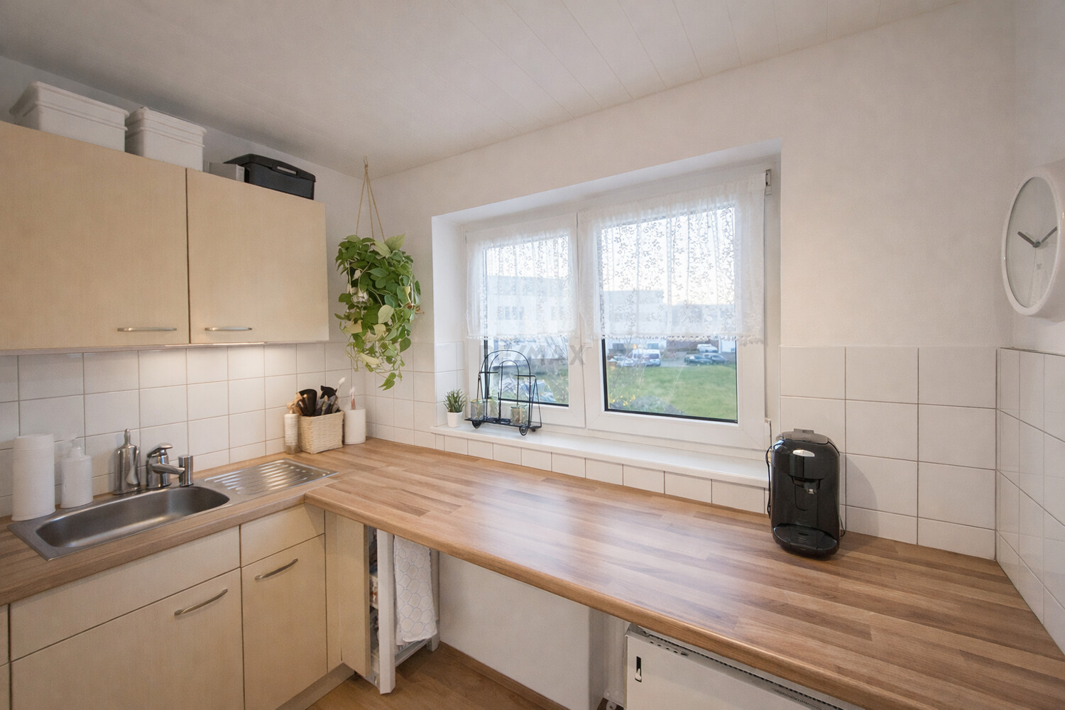 Bereits beim Betreten der Wohnung überzeugt der Wohnbereich, der eine gemütliche Wohnlandschaft und Essbereich bietet. Die Fenster sorgen für eine freundliche Atmosphäre. Das Schlafzimmer ist gut geschnitten und bietet Stellfläche für ein Bett und Schrank.