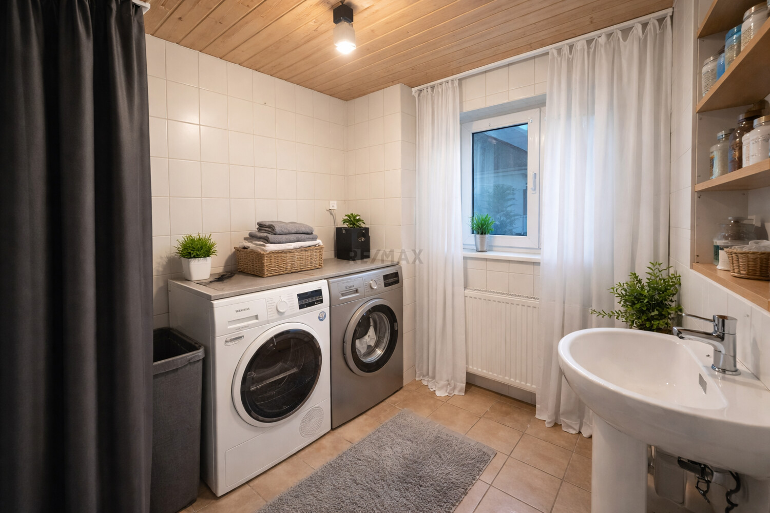 Die Wohnung verfügt über eine Einbauküche, die sämtliche notwendigen Geräte umfasst und funktional in den Wohnalltag integriert ist. Besonders praktisch: Es gibt ein separates WC sowie ein Badezimmer, das Platz für Waschmaschine und Trockner bietet – ein echtes Plus an Komfort.