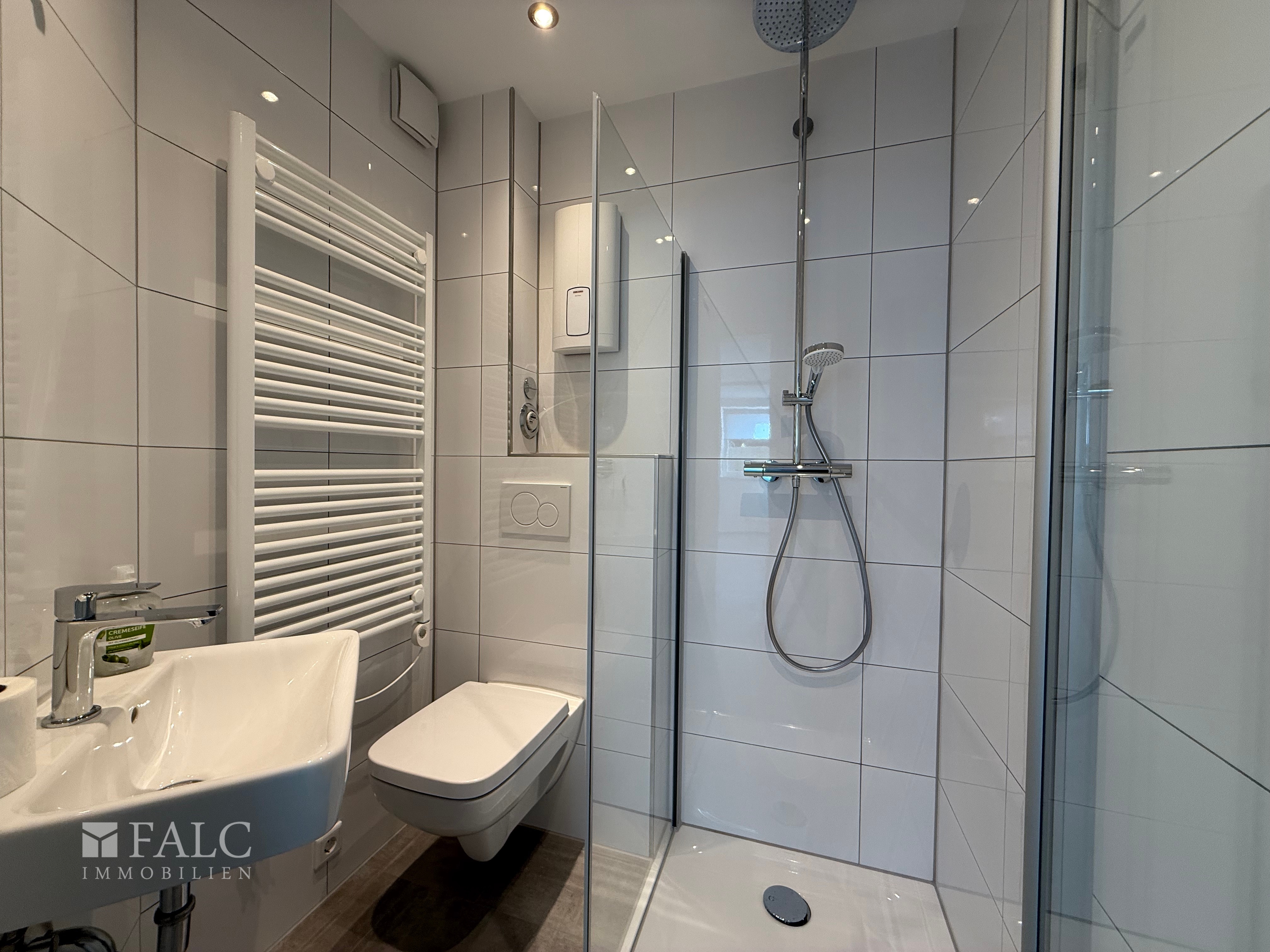 Der offene Wohn- und Essbereich mit Küche erstreckt sich über ca. 20 m2 und überzeugt durch die großen Fenster, die viel Tageslicht hereinlassen. Zusätzlich verfügt die Wohnung über ein Schlafzimmer sowie ein hochwertig gefliestes Badezimmer mit einer ebenerdigen Dusche.